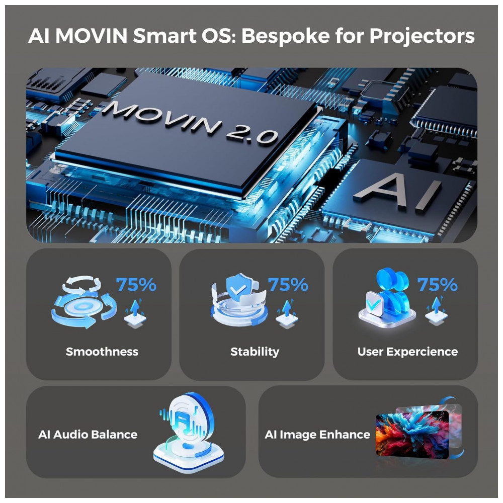Oferece brilho de 2500 ANSI lumens, contraste 25.000:1, gamut NTSC 99% e tecnologias AI PQ/SR para aprimoramento de imagem em tempo real, suportando telas até 762 cm (300 polegadas). Configuração automática com foco AI, correção 6D keystone, alinhamento de tela, detecção de posição e evasão de obstáculos, além de zoom digital 50%-100%.