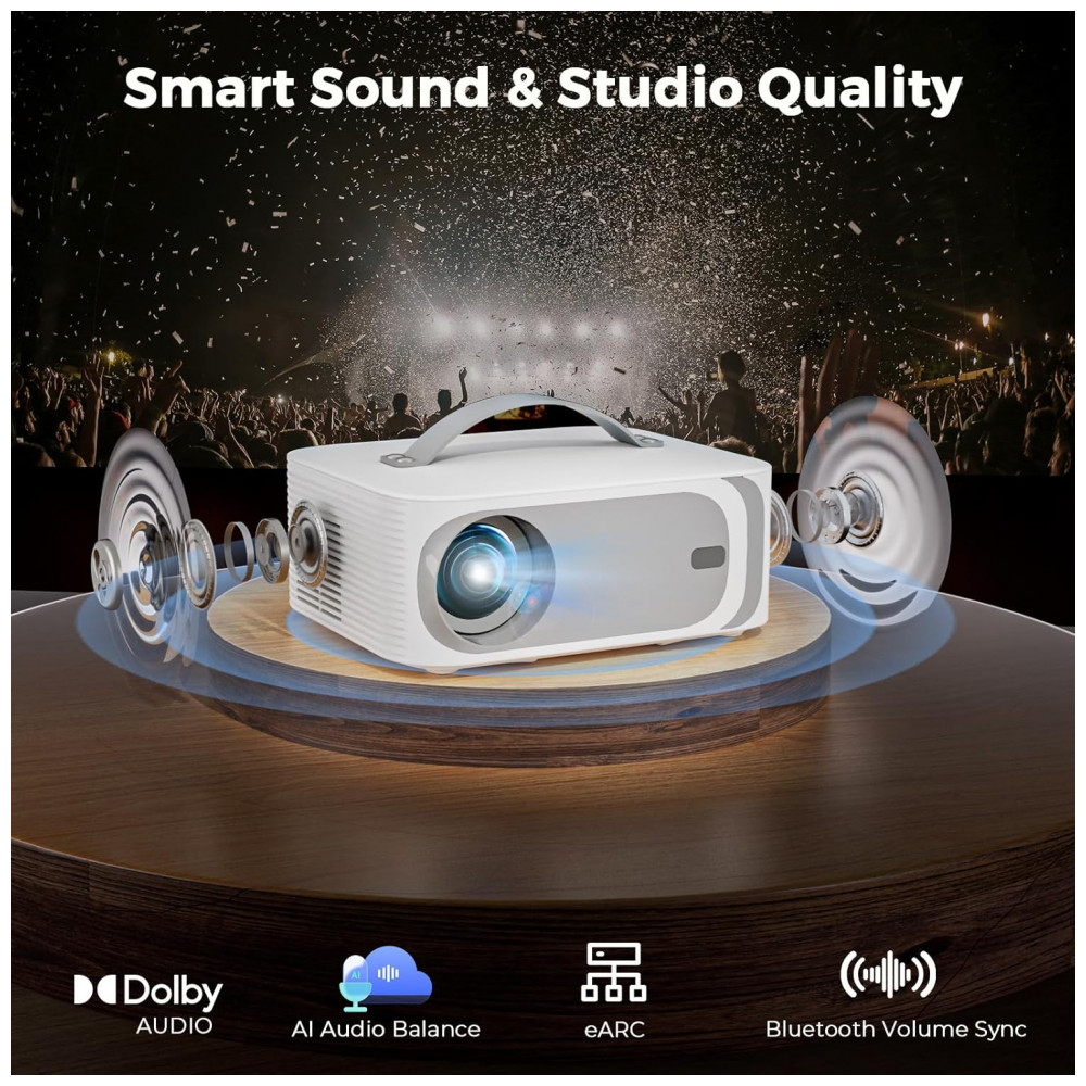 Conta com alto-falantes estéreo duplos 35W Dolby Audio, eARC, Bluetooth 5.2 bidirecional e AI Sound Sync para áudio balanceado. Design compacto com alça para portabilidade, montagem em mesa/teto/tripé/parede, compatível com laptops, PS5 e TV sticks via HDMI/USB/3.5mm. Suporta múltiplos formatos de vídeo incluindo AVI, MKV e MP4.