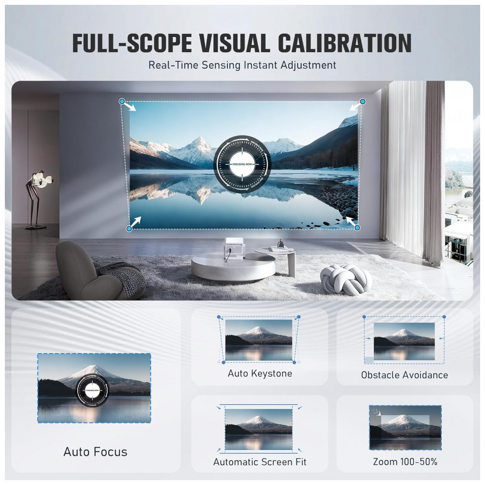 Recomendado para ambientes escuros, suporta zoom 50%-100%, tamanho de imagem de 76 cm a 508 cm e distâncias de projeção de 0,9 m a 3,4 m. Atualizações OTA vitalícias mantêm o software atualizado. Compatível com montagens em tripé, teto, mesa, parede ou chão, facilita uso em quarto, sala ou acampamentos.