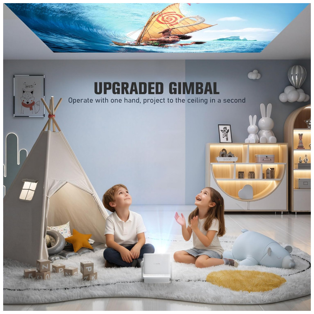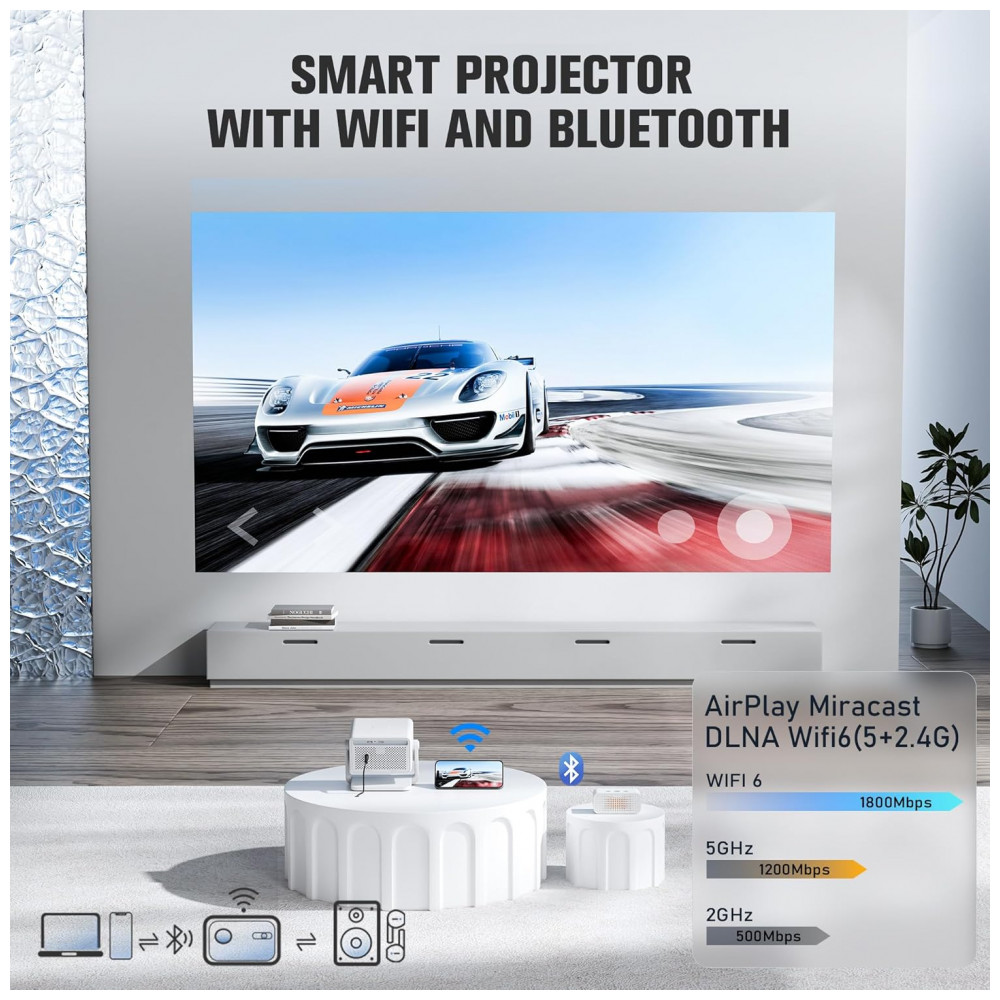 O modelo compacto mede aproximadamente 25,4 cm x 20,3 cm, pesa pouco e inclui suporte rotativo para montagem no teto ou outras superfícies. Conecta via WiFi 6 dual-band, Bluetooth 5.2 bidirecional para fones ou alto-falantes, AirPlay, Miracast e DLNA para espelhamento sem fio de iPhone, Android ou laptops. Alto-falantes estéreo Hi-Fi proporcionam som surround, com portas HDMI, USB e 3,5 mm para consoles de jogos, smartphones e tablets.