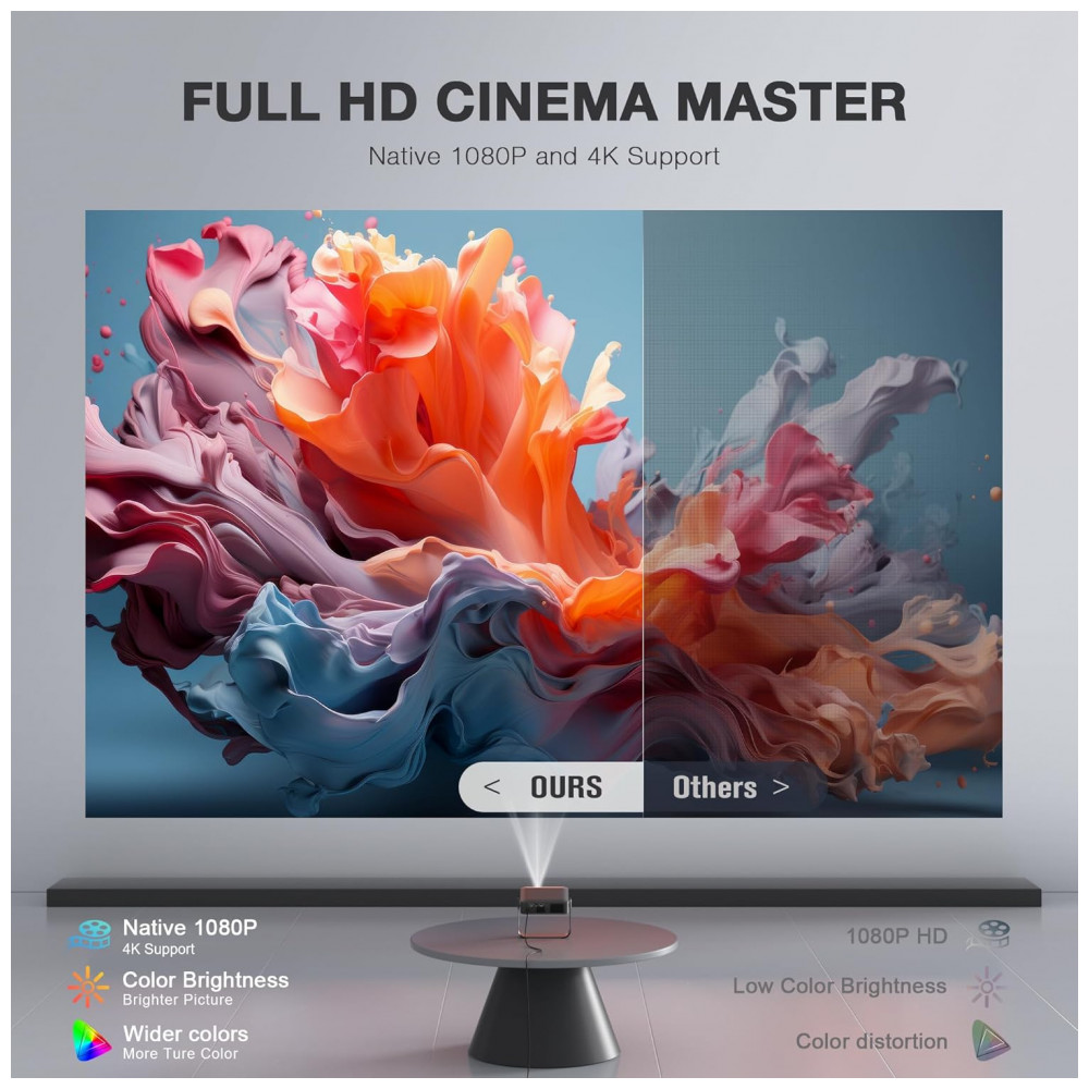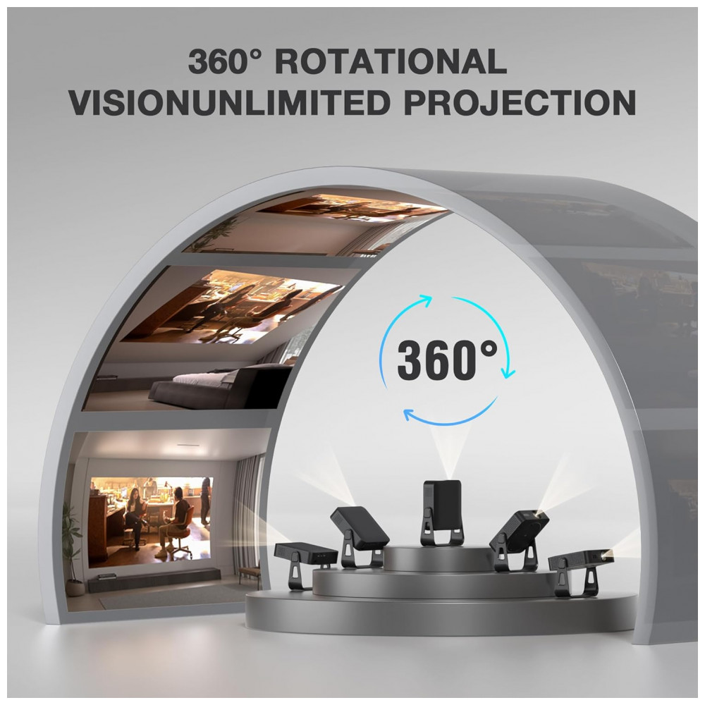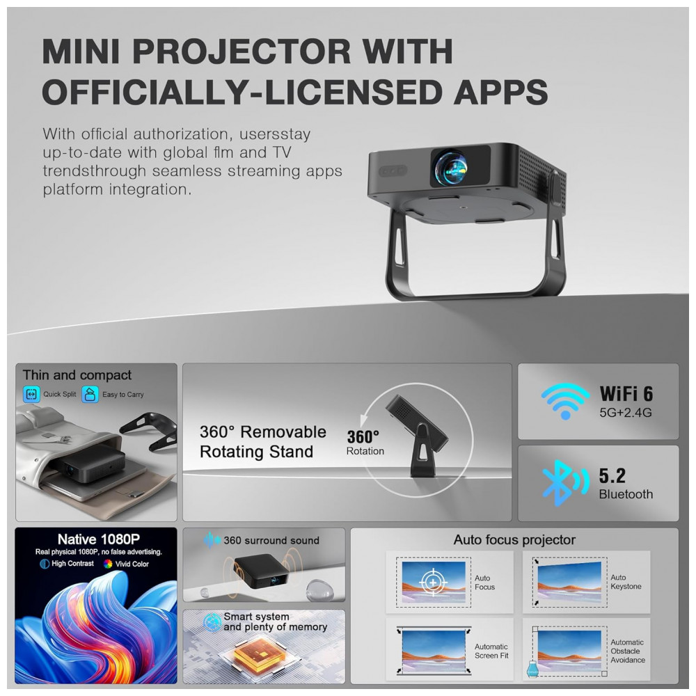 O Projetor Smart Mini XuanPad Q5 é um projetor portátil ultrafino com resolução nativa 1080P e suporte a 4K, destinado a entretenimento em casa, jogos ou acampamentos, com apps oficiais integrados como Netflix, YouTube e Prime Video para acesso direto a conteúdos. Ele inclui suporte rotativo destacável de 360° para montagem flexível em mesa, teto ou parede, foco automático por IA em 3 segundos e correção keystone 6D automática, com dimensões compactas de aproximadamente 17,6 cm x 3 cm x 17,6 cm para transporte fácil em bolsas.