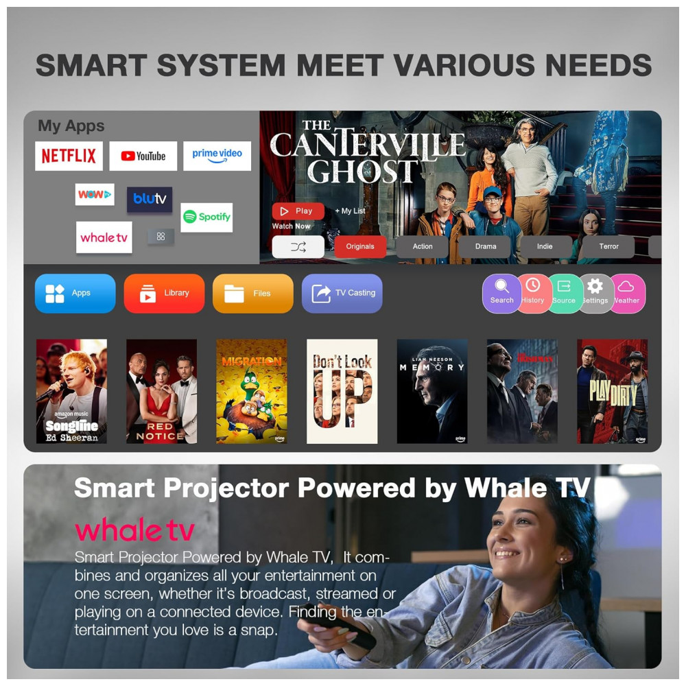 Utiliza lentes nano-alta de três peças duplas e display LCD de alta precisão com tecnologia de reconstrução de gama de cores, sistema de sensoriamento de luz inteligente e certificação ISO 21118 para brilho de 1800 ANSI lumens. Suporta projeção de 102 cm a 508 cm em distâncias de 0,37 m a 6,1 m, com espelhamento sem fio via WiFi dual-band 5G/2.4G e conexão Bluetooth 5.2 para áudio sincronizado.
