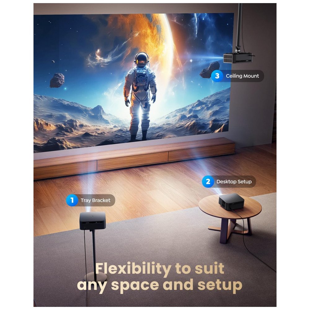 Equipado com lentes ópticas de vidro precisão e 100% gamut de cor, gera imagens de 127 cm a 762 cm em distâncias de 1,2 m a 4,9 m. Mede 28 cm x 24,2 cm x 10,7 cm e pesa 5 kg, suportando montagem em teto, mesa ou tripé com 4 furos M5.