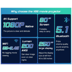 Acompanha Tela de Projeção Portátil! Nosso projetor Full HD V88 1080P inclui uma tela de projeção de 80 polegadas feita sob medida para atender às necessidades de nossos clientes. Ao contrário de outros projetores, nossa tela de projeção incluída permite que você crie seu próprio cinema em casa em qualquer lugar para assistir a filmes, programas de TV, fotos, apresentações de slides e jogar videogames. Esta tela de projeção portátil, dobrável, antirrugas e fácil de lavar de 100 polegadas é maior do que outras, garantindo ângulos de visão mais amplos e detalhes de imagem aprimorados. Resolução Nativa 1080P com Suporte a 4K: A maioria dos projetores similares no mercado utiliza uma tela LCD 720P, mas nosso mini projetor V88 utiliza uma tela LCD nativa Full HD 1080P, o que melhora a qualidade da imagem projetada para uma resolução de 1920×1080. Além disso, adotamos a tecnologia que suporta vídeos 4K, permitindo que este projetor de filmes reproduza vídeos em 4K ao máximo. Conexão WiFi 5G Mais Rápida e Estável: Este projetor de filmes utiliza a mais recente tecnologia WiFi 5G, permitindo espelhar seus dispositivos iOS e Android com o WiFi 5G para assistir a vídeos ou jogar com mais fluidez e estabilidade. O WiFi 5G ultra rápido garante que não haja atrasos ao jogar no celular e assistir ao YouTube, Hulu e Prime Video. Atenção: Se deseja assistir a vídeos com direitos autorais, é necessário conectar via HDMI, Fire TV Stick, Roku ou Chromecast. Função Bluetooth 5.1 e Alto-falante Aprimorado: Com alto-falante integrado aprimorado, você pode desfrutar de uma experiência audiovisual cinematográfica sem conectar alto-falantes externos. Além disso, este projetor portátil possui tecnologia Bluetooth 5.1 integrada para tornar a sincronização de áudio mais rápida e estável. Com este projetor Bluetooth, você pode conectar seus alto-falantes ou fones de ouvido Bluetooth ideais sem fio a qualquer momento para obter um som mais maravilhoso, criando realmente seu próprio cinema em casa. Visualização em Tela Grande de 300 Polegadas: Este projetor de vídeo oferece uma exibição de 30 a 300 polegadas, proporção de 16:9 e correção de keystone de 15°, sendo a solução perfeita para seu cinema em casa ou cinema ao ar livre.