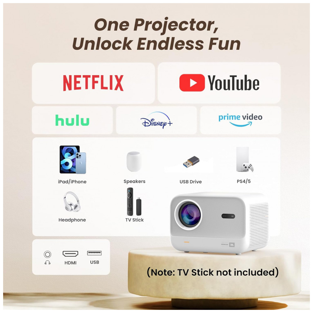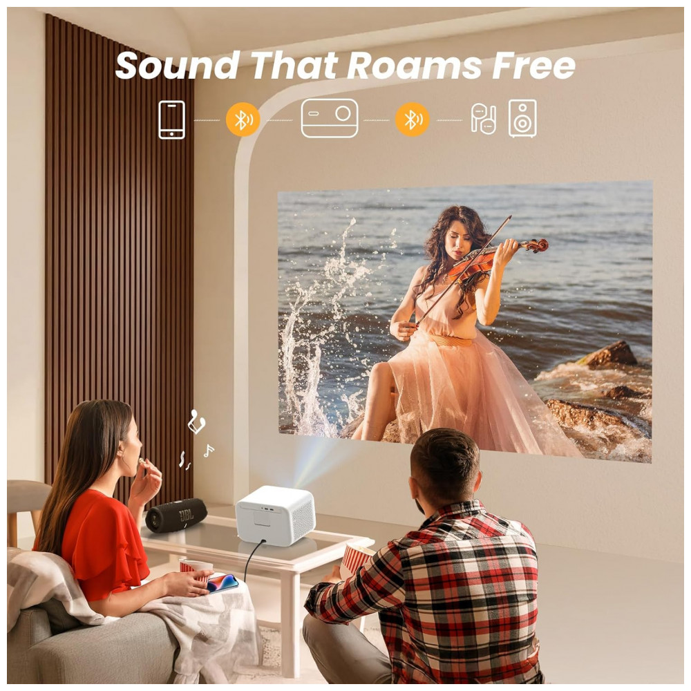 Característica especial: Projetor Nativo Full HD 1080P com Suporte 4K, 2 Alto-falantes JBL de 8W com Áudio Dolby, Foco Automático e Correção Keystone, WiFi e Bluetooth e muito mais,
