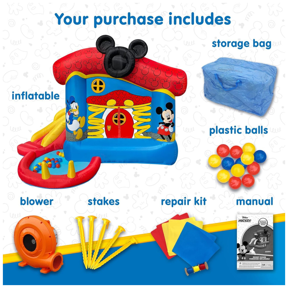 O Mickey Mouse Funhouse vem com acessórios, incluindo soprador inflável com GFCI, estacas de soprador de ar, estacas infláveis, bolsa de armazenamento inflável, kit de reparo inflável, bolas de plástico e manual do proprietário.