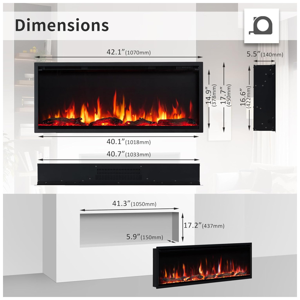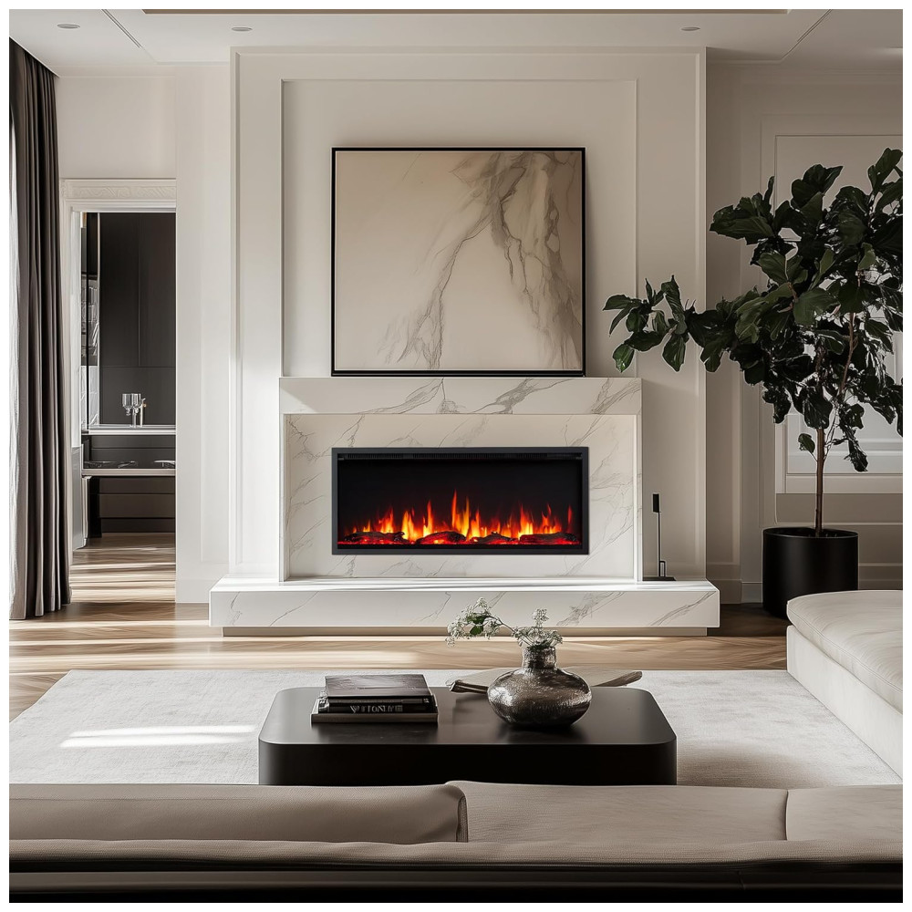 Este modelo de lareira elétrica foi projetado para ser instalado em 6 paredes. Seu design é linear, elegante e contemporâneo, com acabamento para uma aparência limpa. A lareira pode ser instalada diretamente na parede ou embutida em uma parede emoldurada ou independente. É fácil de operar através de um aplicativo de dispositivo inteligente, controle de voz Alexa, Google ou controle remoto. Há 9 cores de chama e leito de combustível, som de estalo com brilho ou volume ajustáveis. Madeira flutuante e cristais estão incluídos, permitindo que você mude a aparência da sua lareira para se adequar ao seu estilo e necessidades. A lareira possui aquecimento baixo e alto, com temperatura definida. Ela pode ser usada com ou sem as chamas. É seguro montar uma TV acima dela. Há duas opções de fiação disponíveis conectar em uma tomada de 110 V ou fazer a fiação fixa.