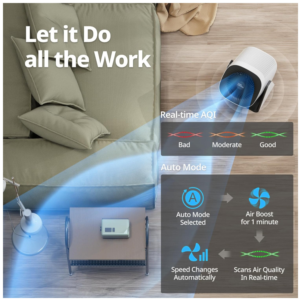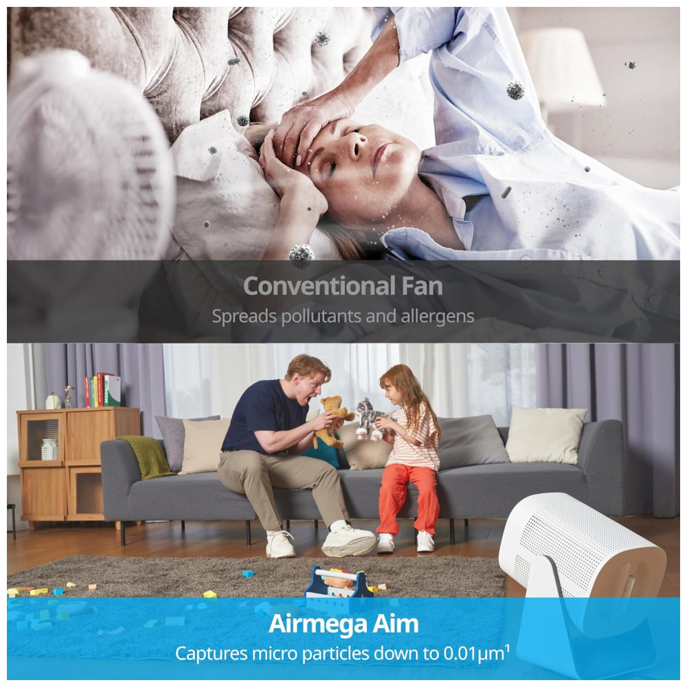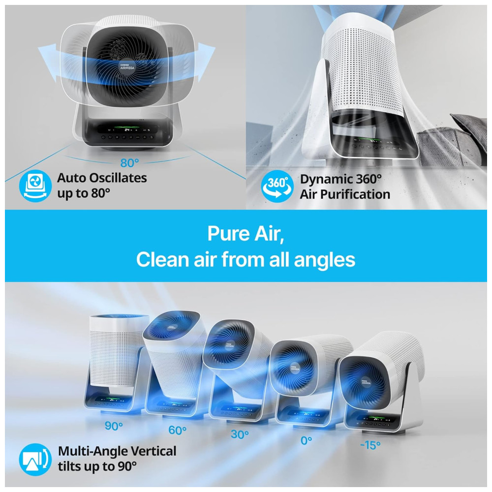 Seu sistema de purificação de ar 360º puxa o ar de todas as direções, maximizando a eficiência da purificação. Além disso, o Airmega Aim também funciona como ventilador, proporcionando ar limpo e fresco em qualquer ambiente.