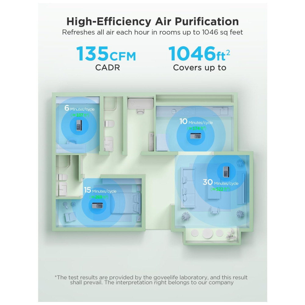 O modo automático pode ser ativado ao emparelhar com o monitor de qualidade do ar GoveeLife, permitindo que o purificador ajuste a velocidade do ar com base nas condições do ambiente PM2.5. É possível controlar o aparelho remotamente e monitorar as tendências da qualidade do ar em tempo real pelo aplicativo GoveeHome, Alexa, Google Assistant e IFTTT.
