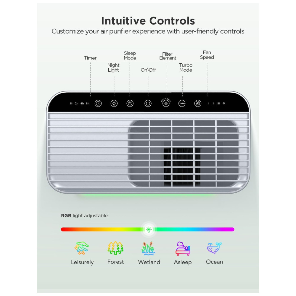 Além disso, o modo de suspensão WhisperQuiet opera a apenas 24,0 dB, garantindo um sono tranquilo e ininterrupto enquanto o purificador mantém o ar do quarto limpo e fresco.