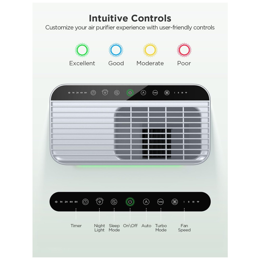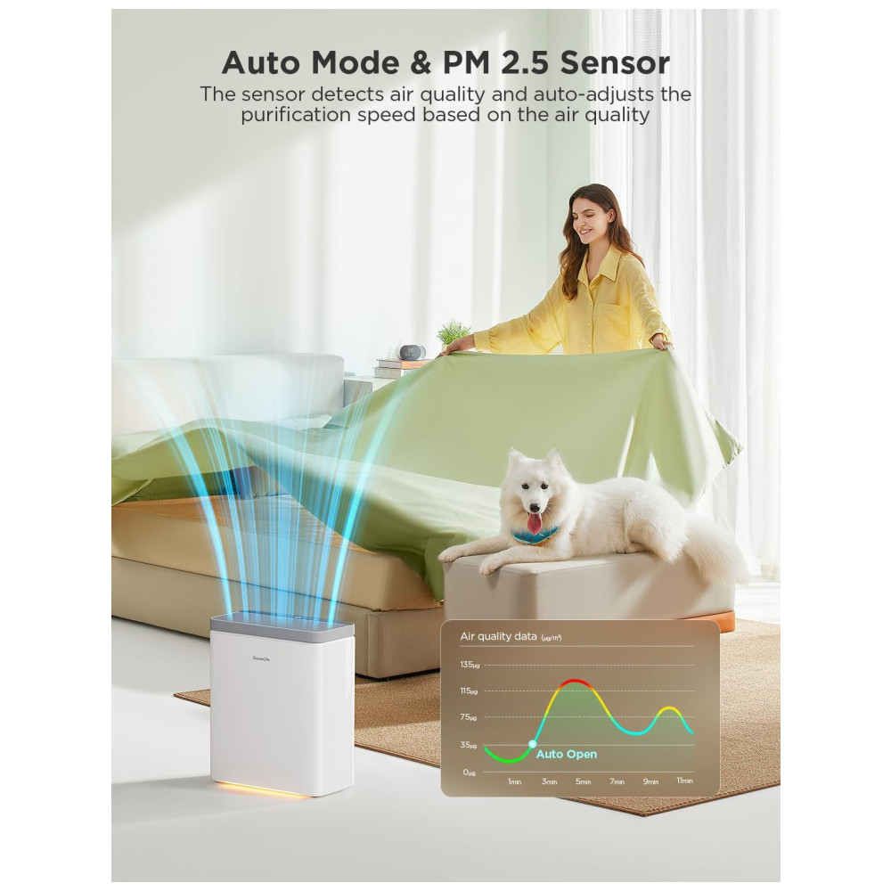 O purificador também conta com um pré-filtro lavável e um filtro de carvão ativado, que remove efetivamente odores de animais de estimação, vapores e compostos orgânicos voláteis (VOCs), garantindo um ambiente interno mais fresco e saudável.