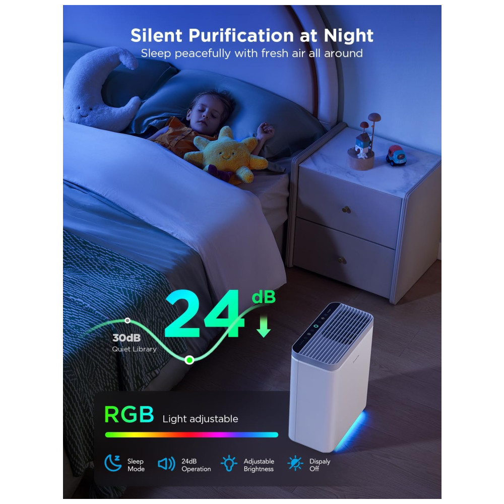 Para um sono tranquilo e ininterrupto, o purificador oferece o Modo de Suspensão WhisperQuiet, operando a apenas 24,0 dB. Assim, você pode desfrutar de um sono profundo enquanto ele garante que o ar do seu quarto permaneça limpo e fresco.