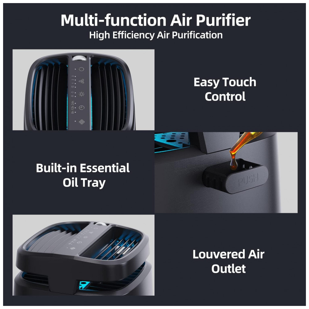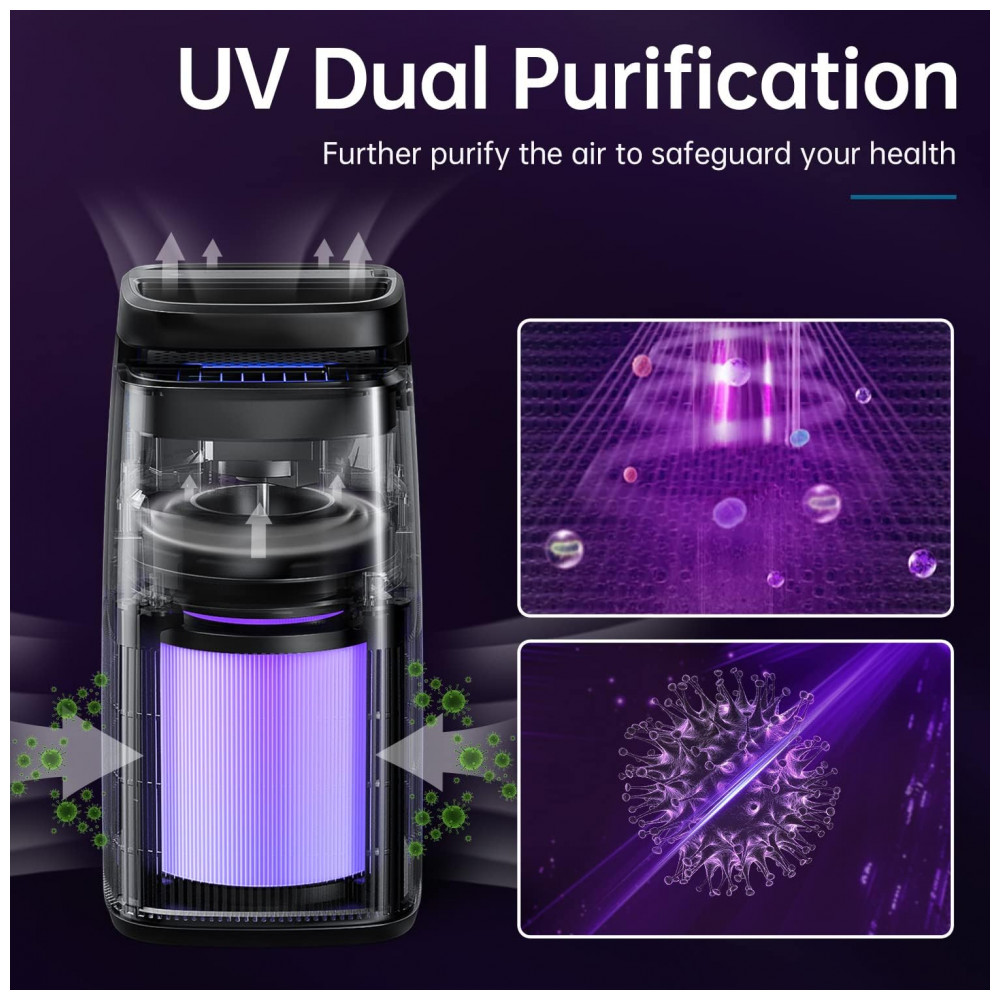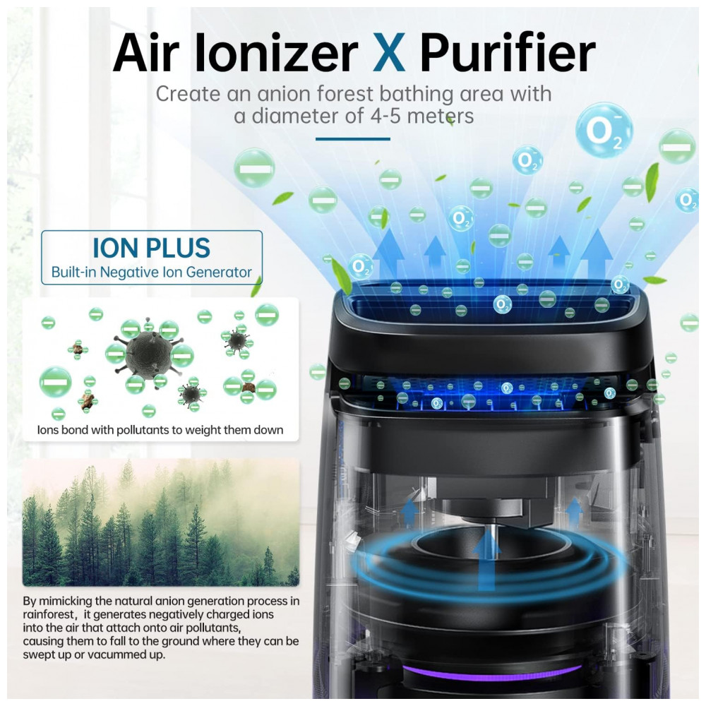 Ionizador de ar e luz UV: gera íons negativos no ar, que podem ser associados a alérgenos flutuantes como pólen, poeira, pêlos e pesá los. Também foi comprovado que reduz efetivamente odores nos quartos. A luz UV incorporada purifica ainda mais o ar que já passou pelo filtro HEPA.