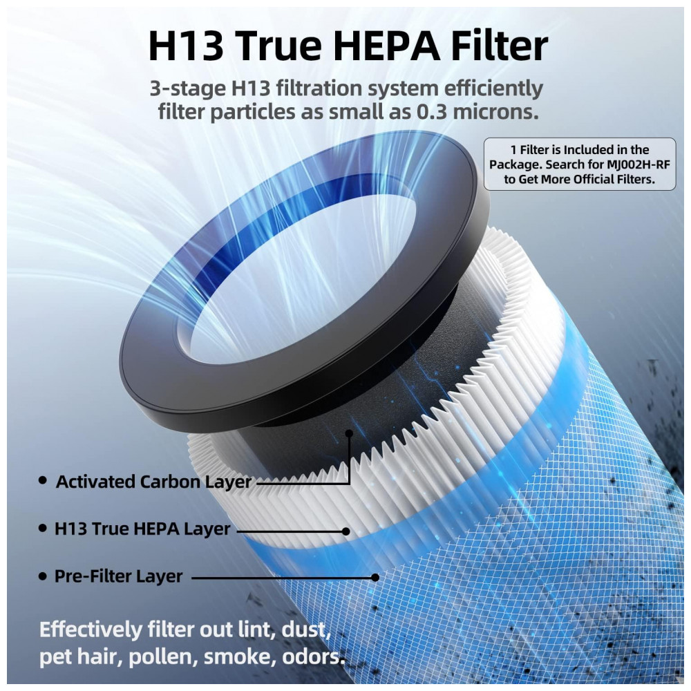 Filtro H13 True HEPA: O purificador de ar MJ002H é inicialmente equipado com um filtro H13 HEPA de 3 camadas. Ele pode filtrar efetivamente 99,97 das partículas transportadas pelo ar tão pequenas quanto 0,3 mícrons, como pólen, poeira, pêlos de animais e fumaça. O carbono ativado absorve efetivamente fumaça, COV e cheiro do ar