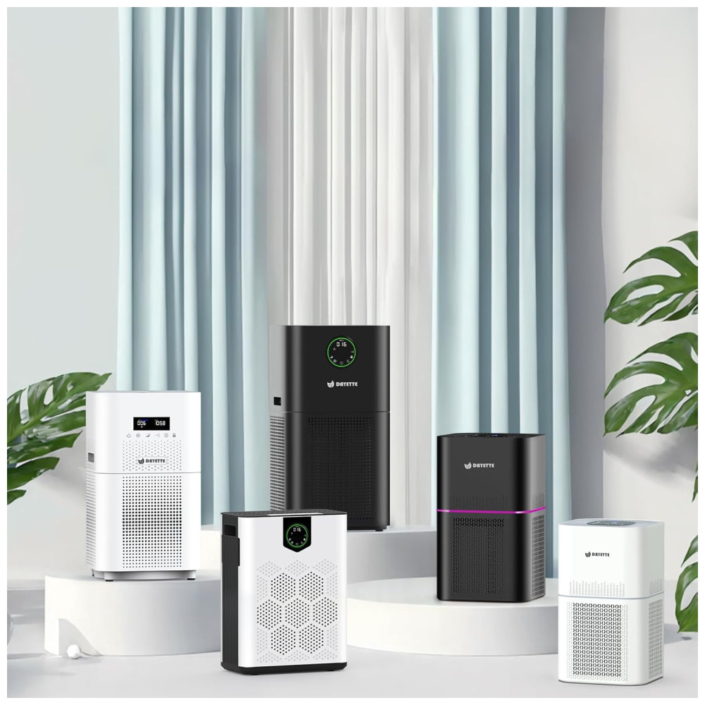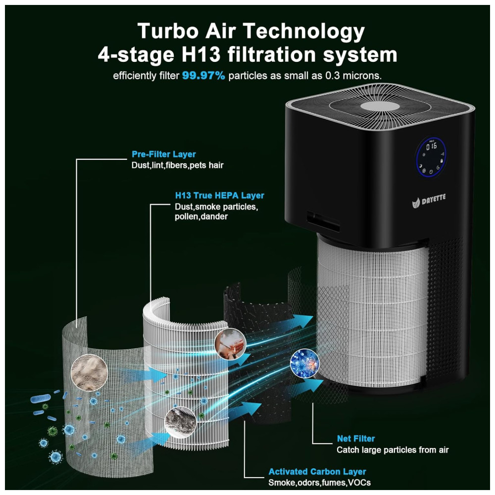 Este purificador de ar possui um sistema de filtragem de 4 estágios, que inclui um pré-filtro e um filtro de carvão ativado de alta eficiência. Ele é capaz de capturar 99,97% das partículas transportadas pelo ar com tamanho de 0,3 mícrons, tornando-se ideal para remover poeira, fumaça, pólen, pelos de animais de estimação e odores de cozinha.
