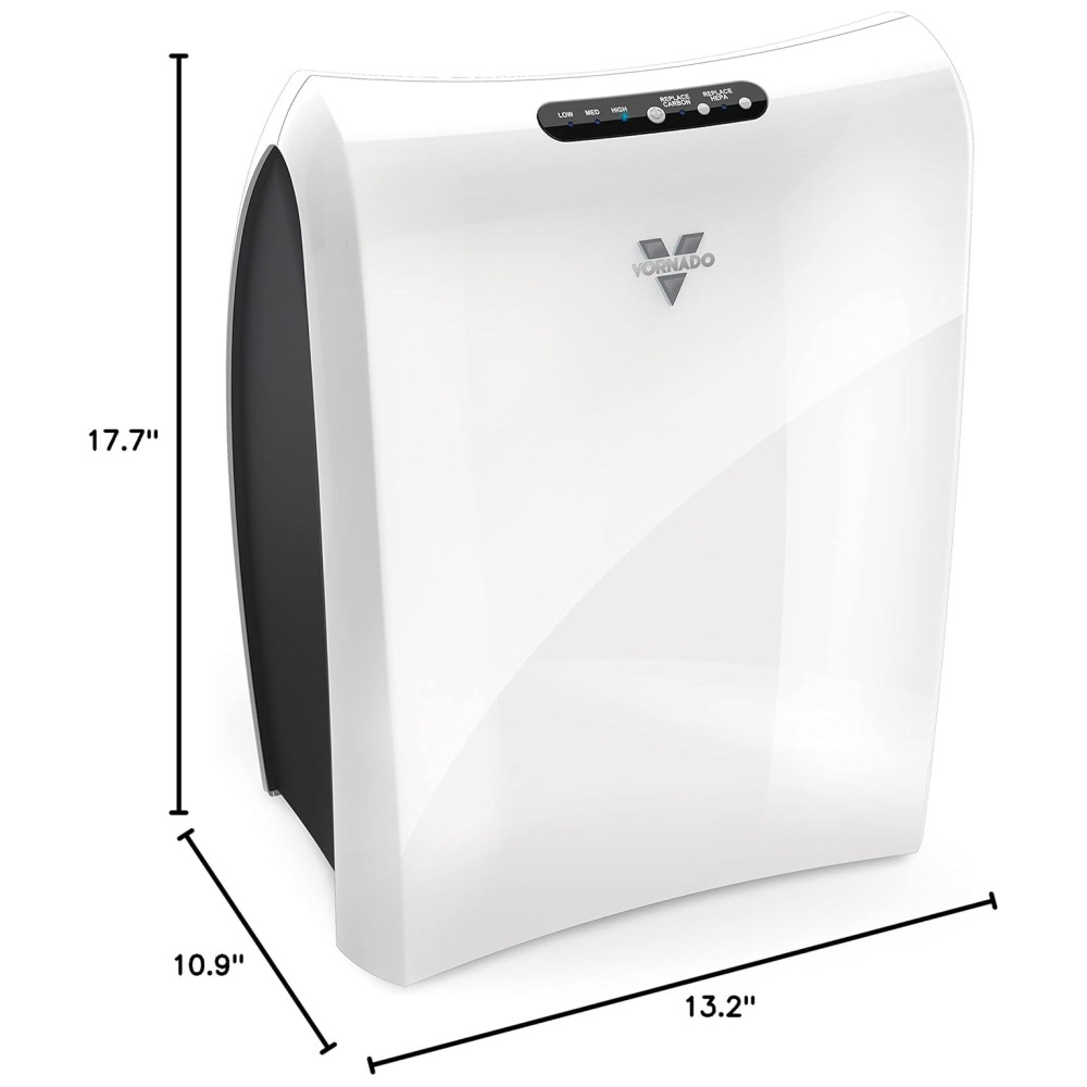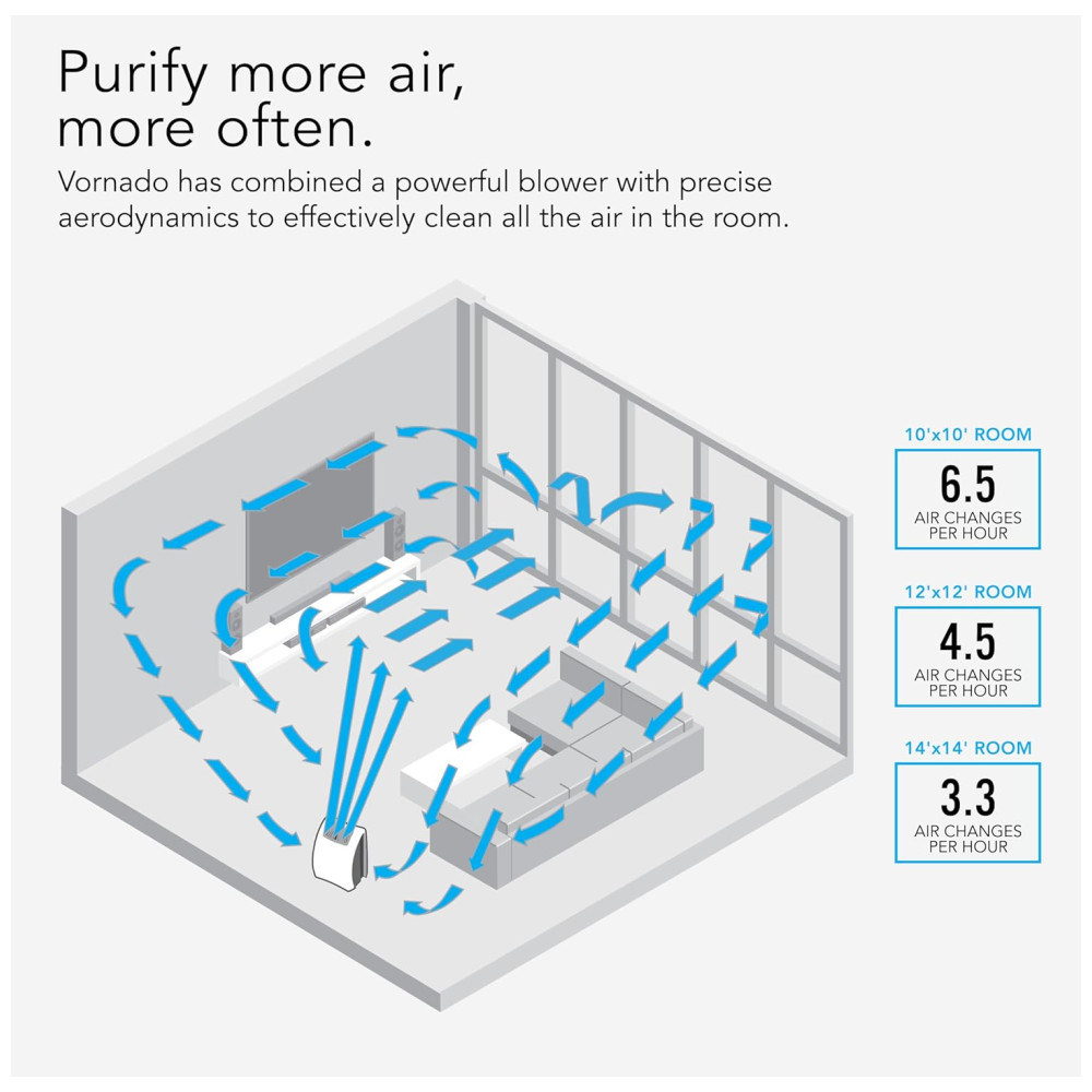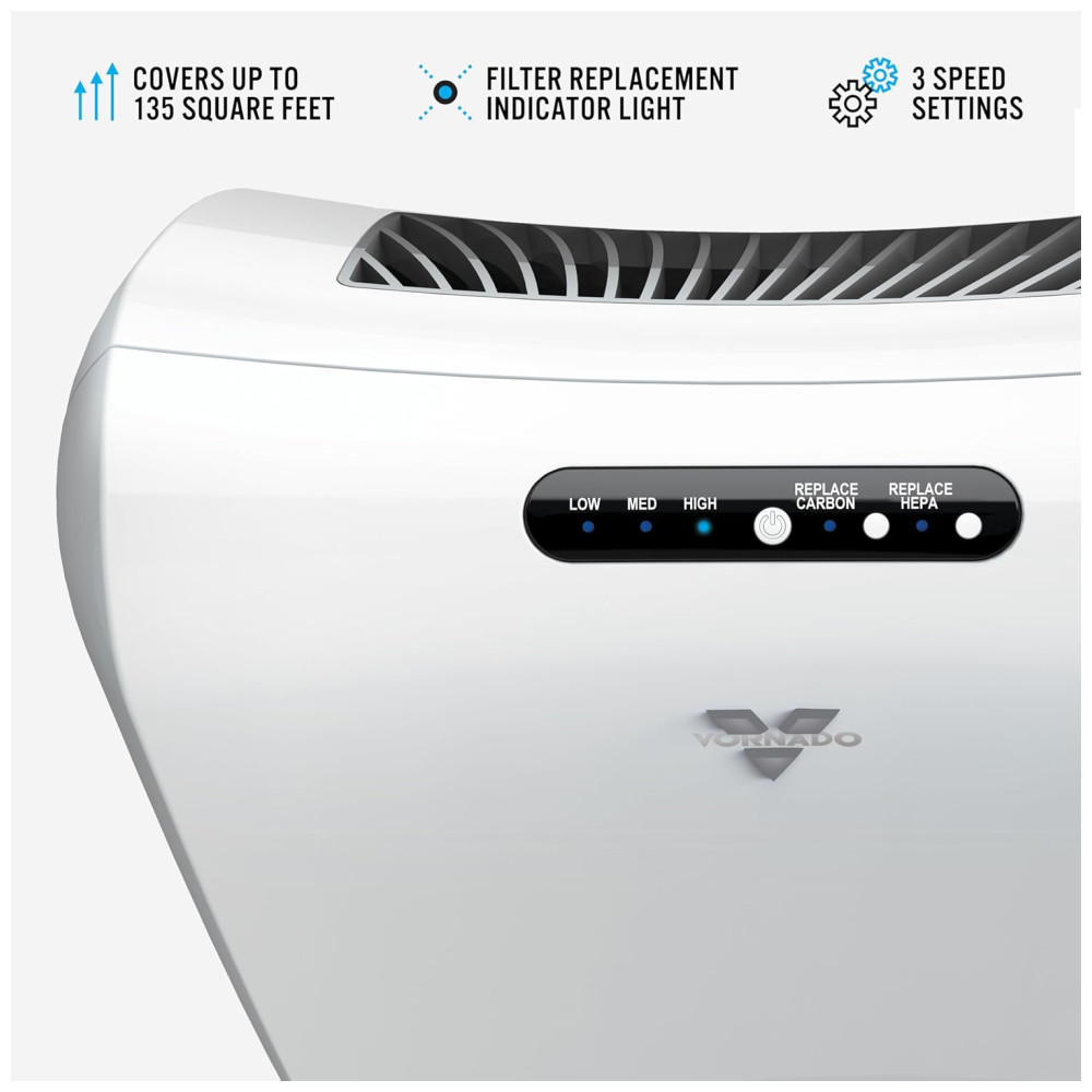 COBERTURA EFICIENTE O purificador de ar Vornado cobre com eficiência pequenas e médias salas, como um quarto, escritório ou cozinha até 220 pés quadrados. A inalação de ar mais fresco ajuda o coração e os pulmões a se manterem em boa forma, além de melhorar a qualidade do sono.