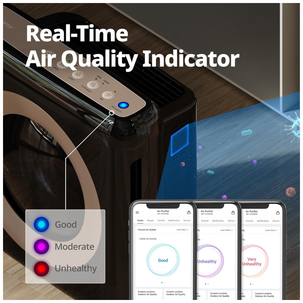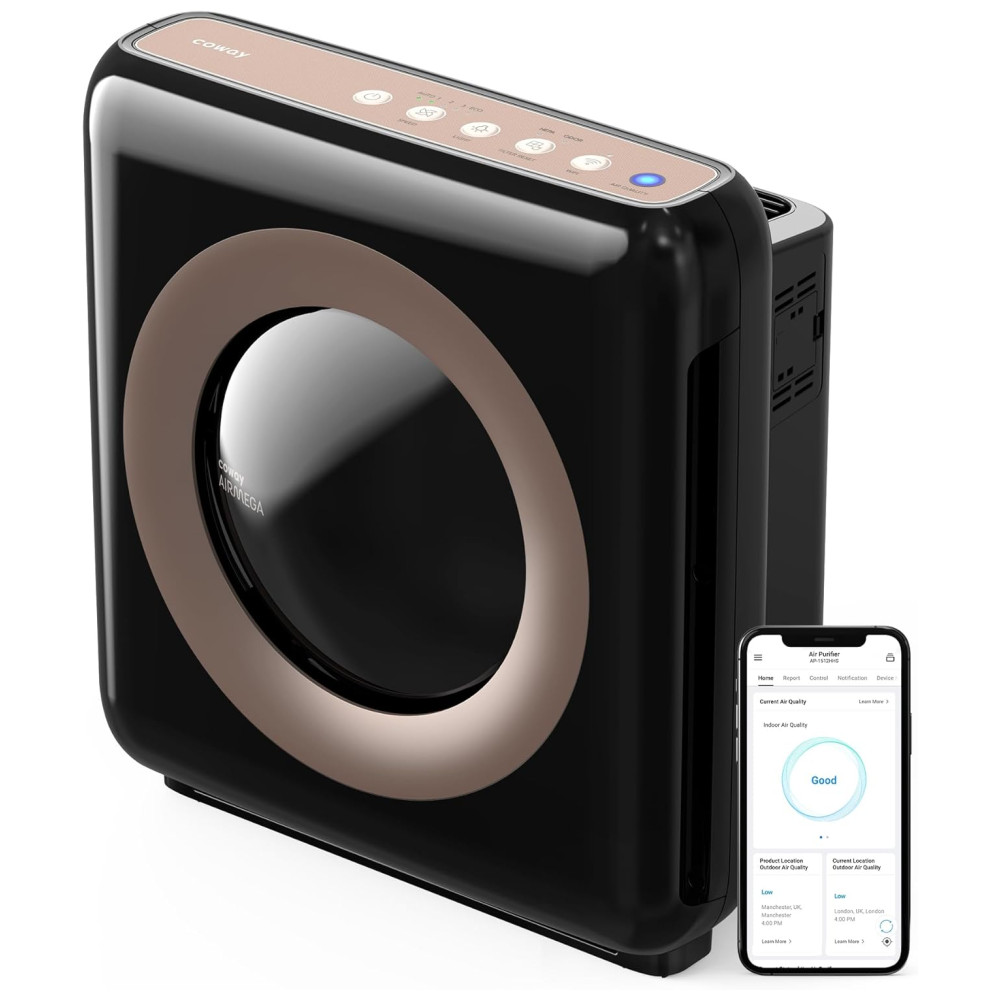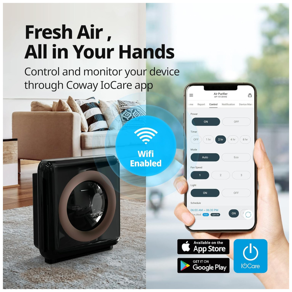 O purificador de ar Coway Airmega AP1512HHS é equipado com WiFi e possui um sistema de filtragem HyperCaptive que captura 99.999 partículas nanométricas de até 0,01 mícron, incluindo alérgenos, bactérias, fungos e vírus. O sistema de filtragem é composto por um pré filtro lavável, filtro de carvão ativo e filtro True HEPA, que reduz efetivamente 99.999 partículas de 0,01 mícron no ar, além de reduzir 99 compostos orgânicos voláteis e odores. O purificador de ar limpa e mantém espaços de até 326 m em 12,5 minutos ou até 788 m em 30 minutos. É habilitado para WiFi com aplicativo Mobile IoCare, permitindo que você monitore a qualidade do ar interno e externo em tempo real, crie relatórios fáceis para se manter informado e controle a partir do seu dispositivo, incluindo desligar, alterar modos ou velocidade do ventilador, criar uma programação e usar um temporizador de 1, 4 ou 8 horas. Além disso, funciona com Google Home e Alexa. O purificador de ar tem um modo automático que monitora constantemente a qualidade do ar e ajusta automaticamente o ventilador para purificar seu espaço de maneira mais eficaz, conforme necessário, proporcionando um novo nível de limpeza em tempo real. Possui também um modo Eco, que desliga o ventilador quando a qualidade do ar na sala permanece purificada por 30 minutos ou mais, para economizar energia, ligando novamente quando for detectada poluição. O purificador de ar tem uma velocidade manual do ventilador de 3 estágios e um sensor de poluição do indicador de qualidade do ar que comunica a qualidade do ar interno em tempo real. A operação é ultra silenciosa com níveis de ruído que variam de 24,0 DB a 53,0 DB.