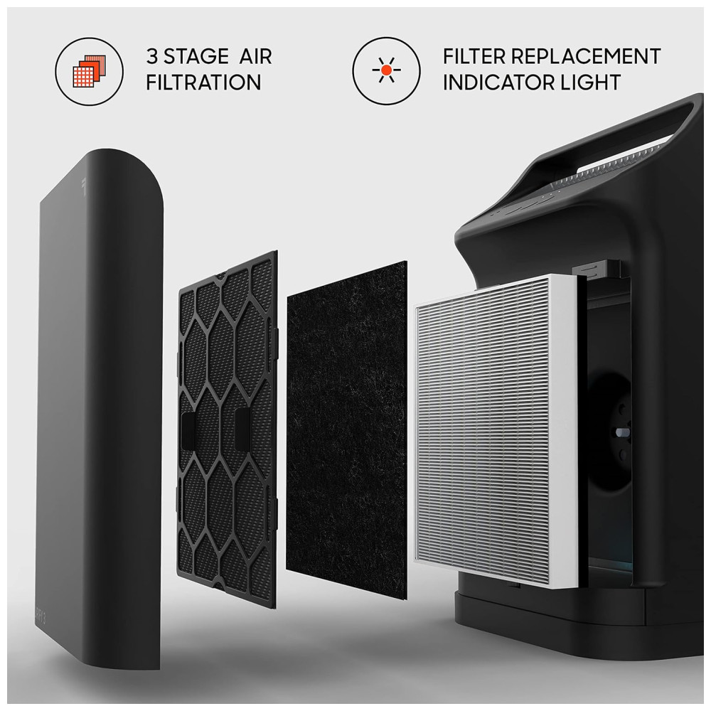 FILTRAGEM EM 3 ESTÁGIOS O pré filtro purifica o ar de partículas maiores. O filtro HEPA verdadeiro filtra com eficácia os alérgenos e o filtro de carvão ativado captura odores e prolonga a vida útil do filtro HEPA.