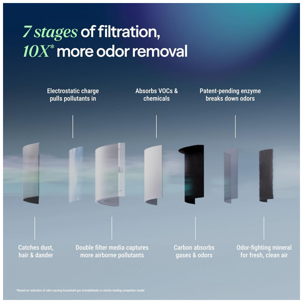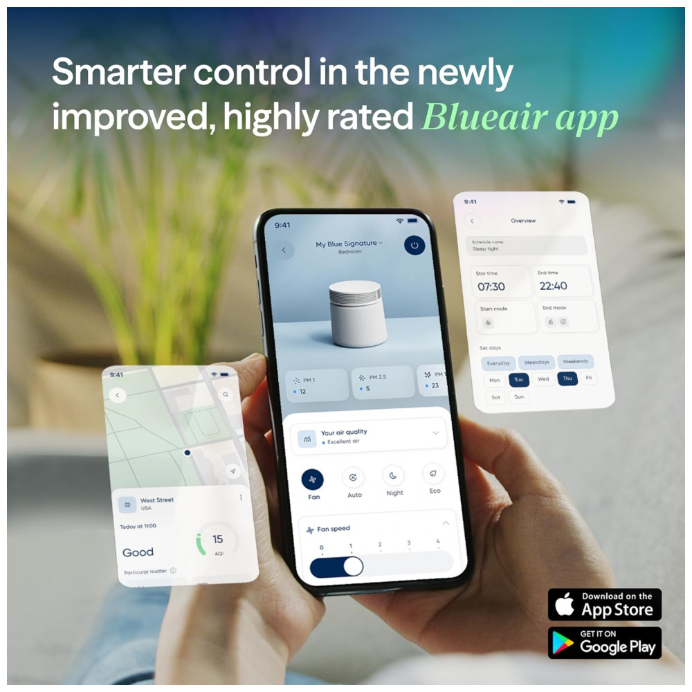 Conheça o Blueair Blue Signature, a próxima geração de inovação em ar limpo, projetado para performar e impressionar. Este poderoso purificador de ar combina filtragem avançada de 7 estágios com tecnologias patenteadas HEPASilent e OdorFence para remover 99.97% das partículas em suspensão até 0.1 mícron. Utilizando enzimas e minerais de base biológica, ele elimina gases e odores a nível molecular, proporcionando até 10 vezes melhor remoção de odores do que filtros de carbono convencionais. Projetado com fluxo de ar Surround Boost, o Blue Signature dobra a eficiência de purificação mantendo um design compacto, inspirado na Suécia, que também funciona como uma mesa elegante. Um display de matriz ponto a ponto ativado por movimento ganha vida conforme você se aproxima, fornecendo insights visuais da qualidade do ar de forma rápida com animações em tempo real. Personalize sua experiência com múltiplos acessórios opcionais. Controle facilmente as configurações, acompanhe as tendências de qualidade do ar e agende limpezas via aplicativo conectado. Os modos Noturno e Automático garantem ar limpo sem barulho ou transtornos, enquanto a troca rápida de filtro e as superfícies fáceis de limpar tornam a manutenção simples. Projetado para ar limpo. Construído para o cotidiano. Testado contra gás Acetaldeído vs. filtro de competidor similar Testado contra PM2.5 por até 90 minutos Comparado ao Blue Pure 211 FILTRAGEM HEPASILENT DE 7 ESTÁGIOS A dupla filtragem captura 99.97% das partículas em suspensão até 0.1 mícron, incluindo fumaça, poeira e alérgenos, utilizando tecnologia mecânica e eletrostática. O fluxo de ar Surround Boost e o filtro OdorFence aprimoram a purificação de ambiente inteiro, degradando odores, gases e COVs com baixo ruído e consumo de energia. ODORES BLOQUEADOS A Tecnologia OdorFence utiliza enzimas e minerais de base biológica para degradar moléculas de odores e gases, removendo até 10 vezes mais odores. MODO FRESCO AUTOMÁTICO Sensores de laser avançados monitoram a qualidade do ar em tempo real e ajustam automaticamente a velocidade do ventilador para manter seu ar fresco o dia todo. Aprende seus hábitos e se adapta às suas necessidades ao longo do tempo. CONTROLE VIA APLICATIVO ASSISTENTE DE VOZ Personalize configurações, agende limpezas, acompanhe tendências de qualidade do ar interno e externo ao longo do tempo e receba alertas de substituição de filtro, tudo pelo seu telefone. Compatível com Amazon Alexa e Google Home. AQI VISUAL Integrado discretamente na saída de ar, o indicador frontal de qualidade do ar exibe níveis de poluição em tempo real com 5 cores fáceis de ler – de azul excelente a vermelho fraco – além de uma animação sutil quando está ativamente limpando. DISPLAY INTERATIVO Tela premium de matriz ponto a ponto com controles voltados para cima detecta movimento e acorda automaticamente conforme você se aproxima. Animações lúdicas refletem as configurações ativas – como uma lua dançante no Modo Noturno – tornando a qualidade do ar mais intuitiva e envolvente. FUNCIONA COMO MESA Design elegante, inspirado na Suécia, com uma superfície plana que funciona como mesa lateral. Leve e compacto, com acessórios opcionais para personalizar e complementar qualquer decoração de casa. MANUTENÇÃO FÁCIL Projetado para conveniência diária com um filtro de troca rápida patenteado, fácil de substituir – sem ferramentas, sem transtornos. Dobre a vida útil do filtro graças ao nosso design inovador, com tecnologia RealTrack que monitora o uso real e alerta quando é hora de substituir.