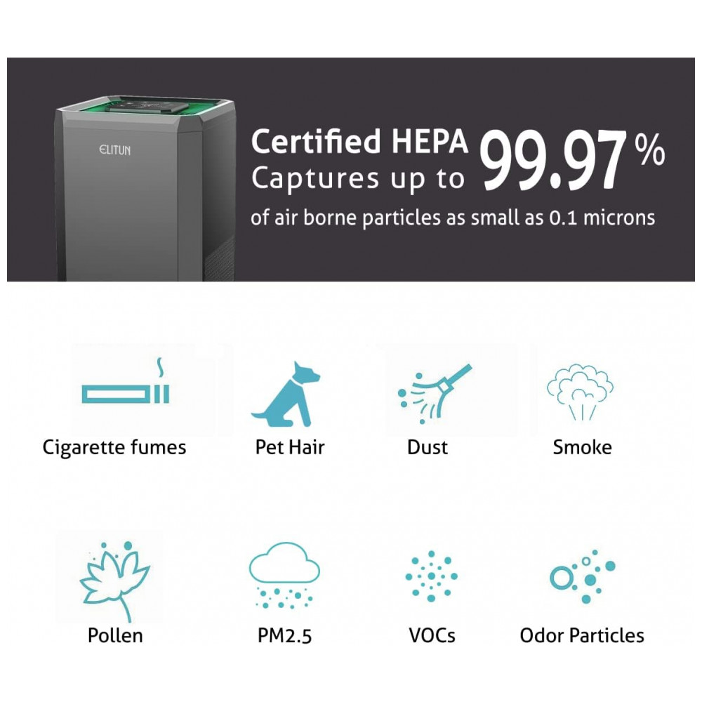 Filtro H13 True HEPA Remove até 99,97 das partículas nocivas transportadas pelo ar, incluindo fumaça de cigarro, VCOs, pêlos de animais, pólen, odores de cozinha, poluição e muito mais até 0,1 mícron de diâmetro. Captura partículas mais finas do que HEPA11 0,3 mícrons