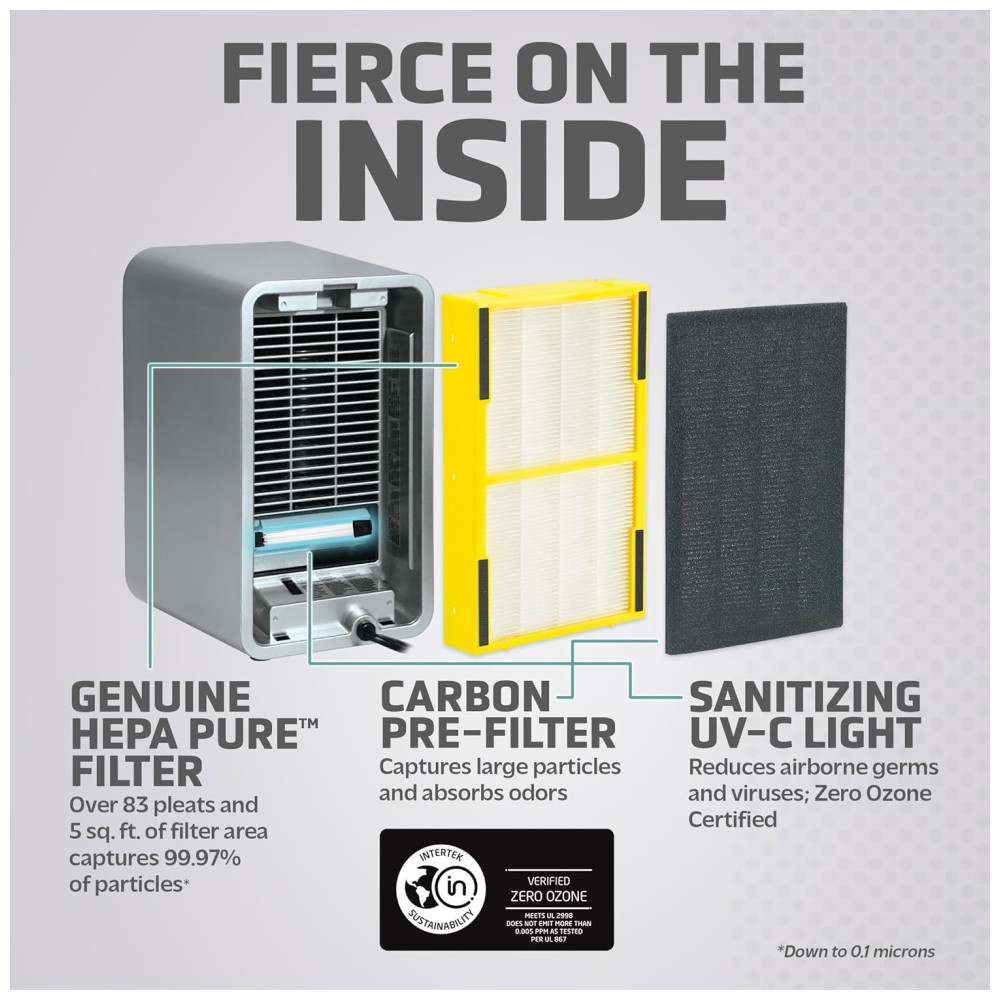 REDUZ OS GERMES a luz UV C ajuda a matar vírus transportados pelo ar, como Influenza, staph, rinovírus e funciona com o dióxido de titânio para reduzir os compostos orgânicos voláteis. A luz UV C opcional fornece defesa adicional contra germes e esporos de fungos