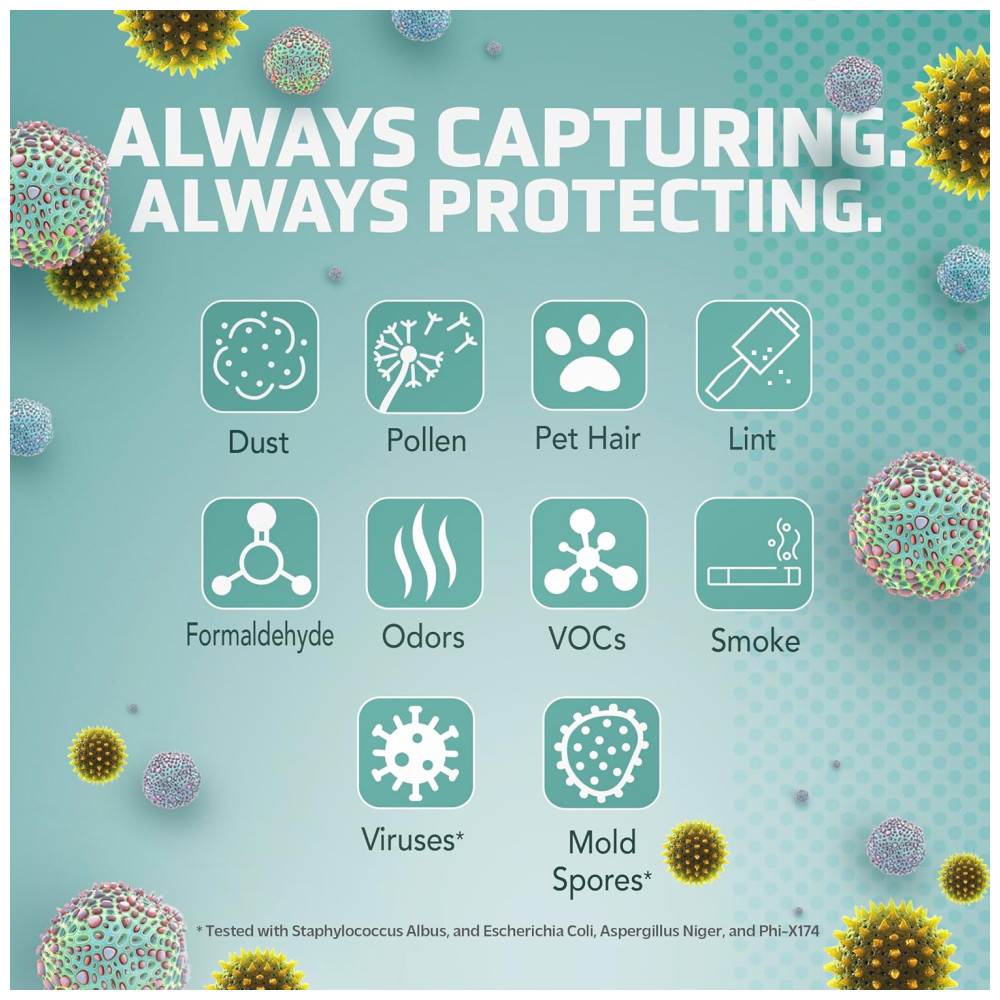 REDUZ OS ODORES O filtro de carvão ativado ajuda a reduzir odores comuns e indesejados de animais de estimação, fumaça, tabaco, bactérias, fumaça de cozinha, fumaça de incêndio florestal e muito mais. Respire um ar mais fresco e limpo em sua casa, independentemente da estação