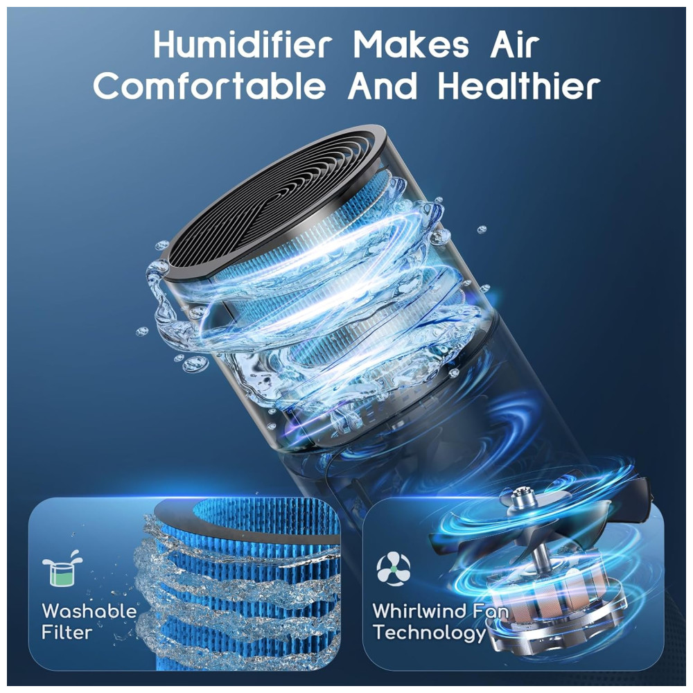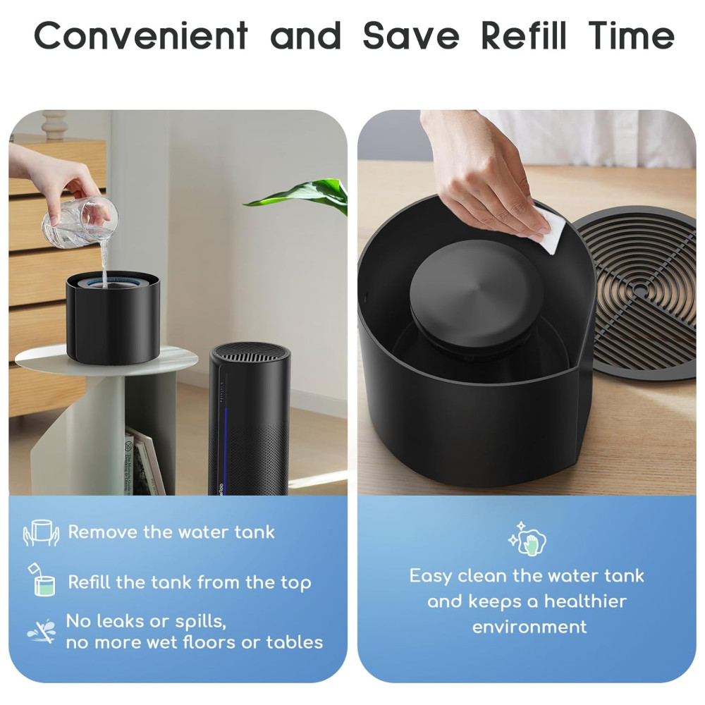 Umidificação evaporativa O umidificador evaporativo funciona segundo o princípio evaporativo para converter a água invisível em nanomoléculas de água para umedecer o ar. O ar úmido em evaporação não contém impurezas, e a névoa sem água não acumula poeira, não vaza água e desfruta de uma vida saudável. É realmente pura umidificação sem névoa. Ajuda a combater tosse, alergias, pele seca, rugas, insônia e sangramento nasal.