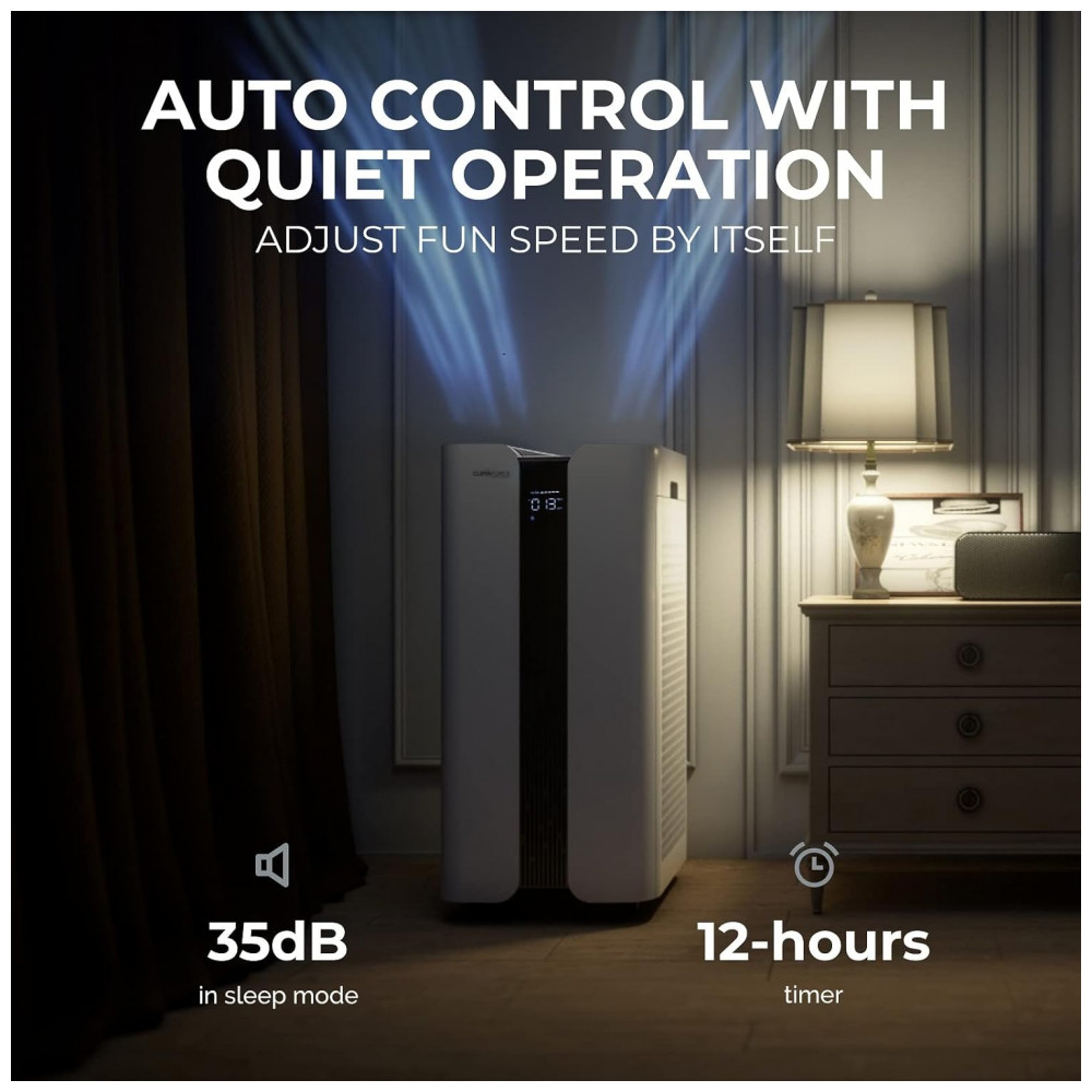 OPERAÇÃO AUTOMÁTICA O purificador de ar inteligente ajustará a velocidade do ventilador automaticamente com base na qualidade do ar em tempo real no modo inteligente. Calma o suficiente para dormir, mesmo com um CADR tão grande com apenas 35 dB na configuração mais baixa. Purificador de ar silencioso para quarto, sala de estar, escritório, sala de aula.