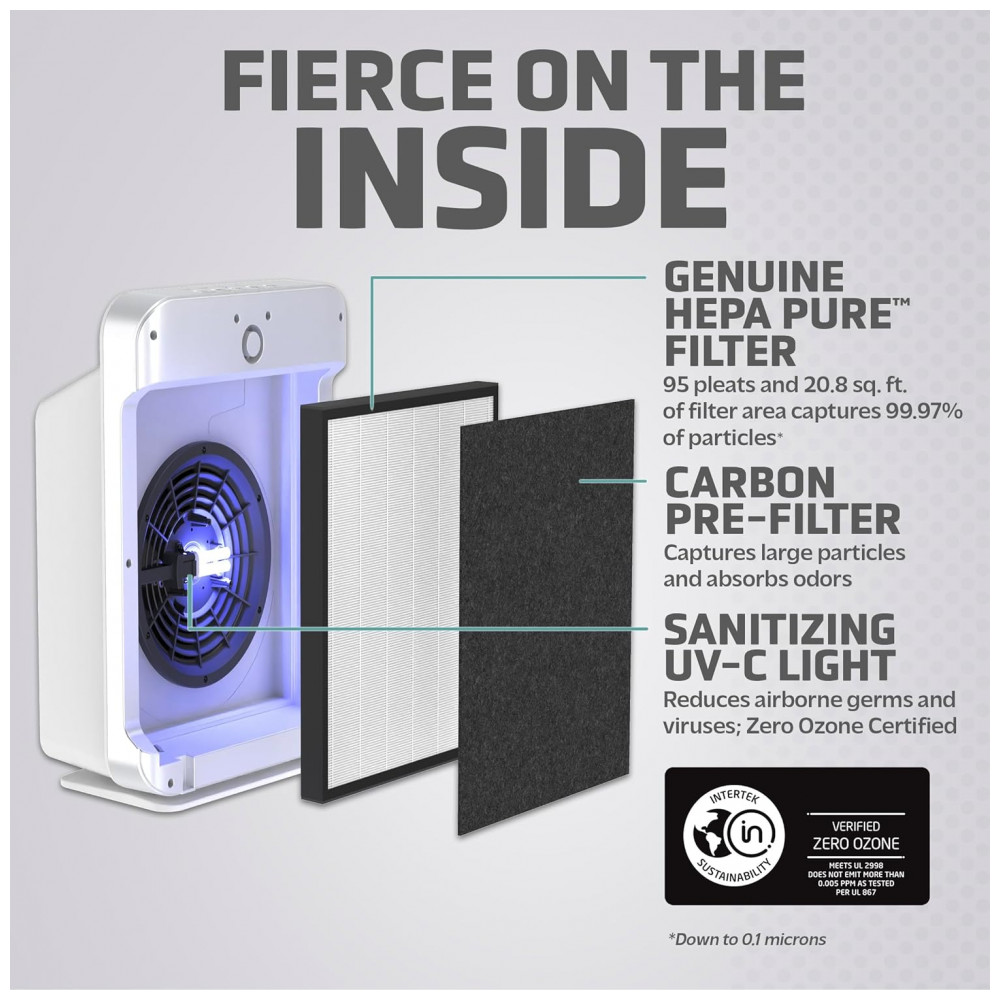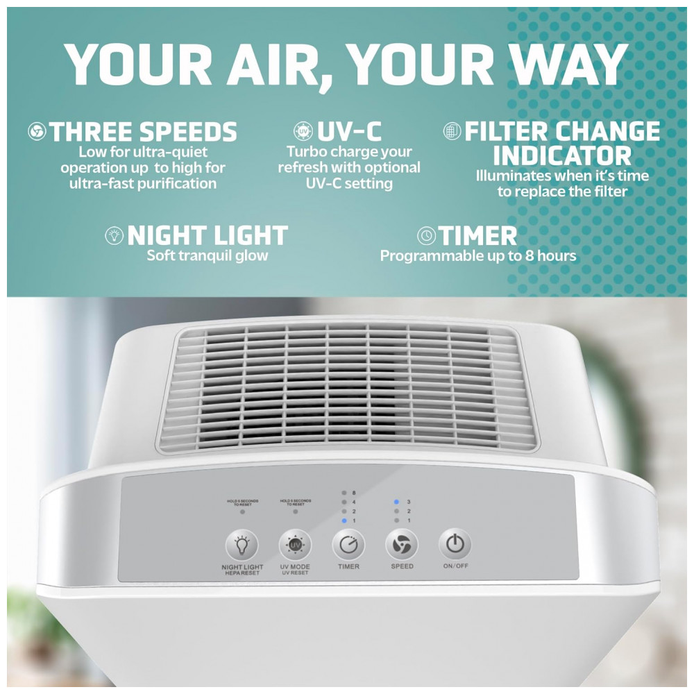 Este purificador de ar de console de tamanho médio é perfeito para quem sofre de alergias. Com um filtro HEPA, ele captura 99,97 de poeira e alérgenos tão pequenos quanto 0,3 mícrons de tamanho Um grande filtro de carbono ataca odores domésticos comuns, incluindo aqueles cas por fumaça, culinária e animais de estimação. E trabalha para reduzir os muitos COV emitidos por produtos domésticos comuns e produtos químicos de limpeza. A luz UV C ajuda a reduzir bactérias, vírus, esporos de mofo no ar e trabalha com dióxido de titânio para reduzir compostos orgânicos voláteis. Escolha entre 3 velocidades, dependendo das suas necessidades, incluindo uma baixa velocidade que funciona ultra quiet e que é ótima para pessoas que dormem com luz. Ele também possui um timer que pode ser configurado por até 8 horas. Com 55 centímetros de altura, este console de tamanho médio é ideal para uso em salas de até 33 metros quadrados