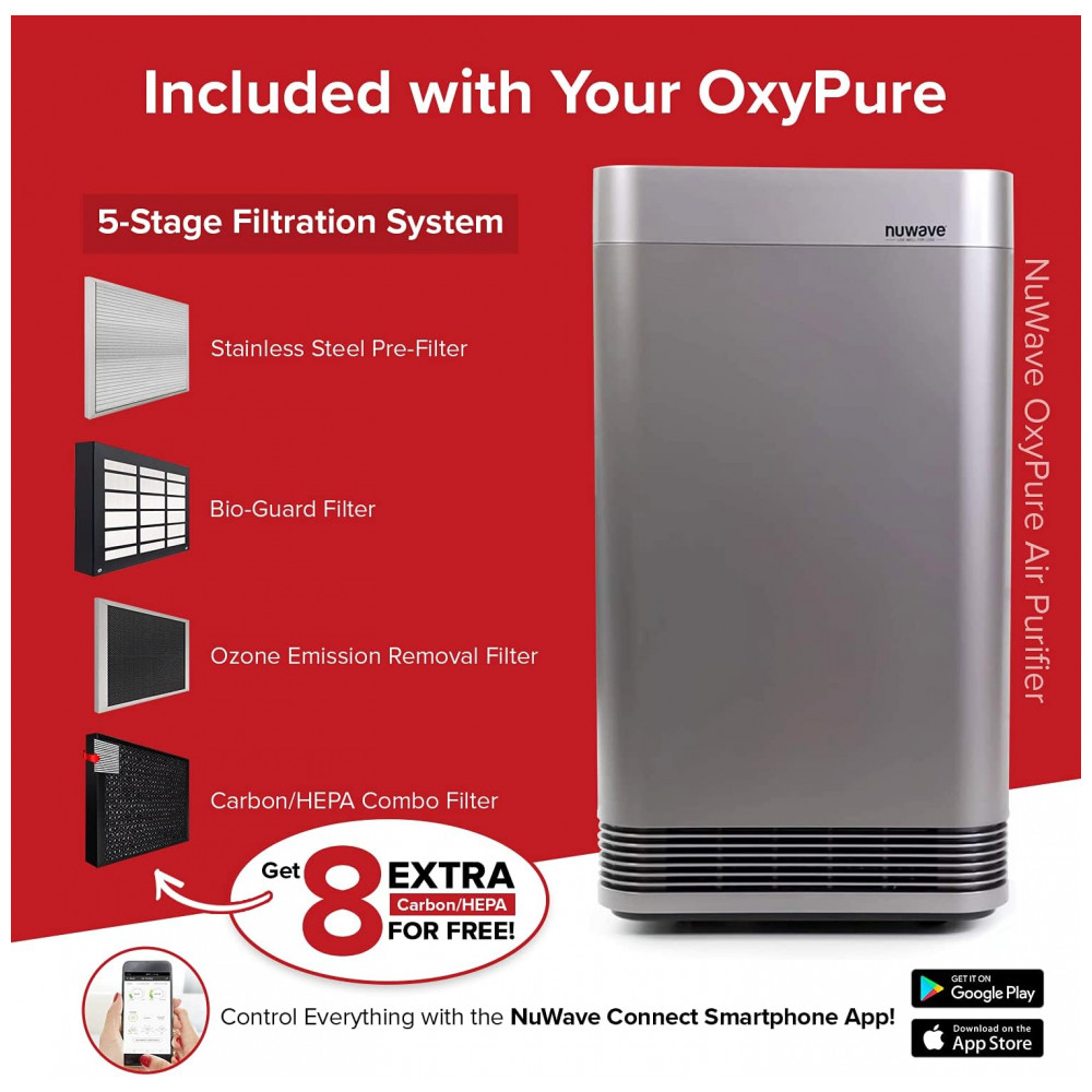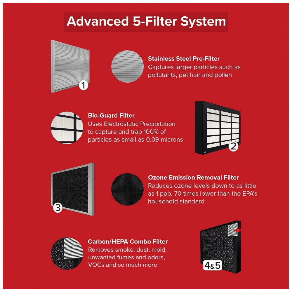 PROTEÇÃO REVOLUCIONÁRIA DE 5 CAMADAS O revolucionário filtro Bio Guard e pré filtro de aço inoxidável, lavável e reutilizável por até 20 anos. Filtro de remoção de emissão de ozônio reutilizável por até 20 anos. Inclui 8 filtros combinados HEPA, Carbono.