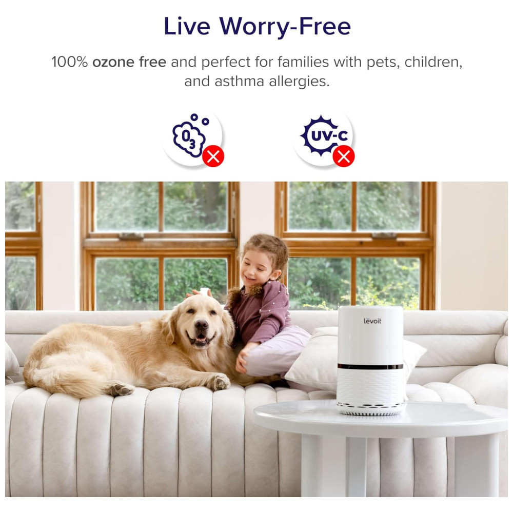 FILTRAÇÃO SEM OZÔNIO A segurança é prioridade máxima Os métodos de purificação de luz UV C podem produzir altos níveis de ozônio que podem ser prejudiciais para crianças, pacientes com asma e animais de estimação. Este purificador de ar usa apenas filtragem premium, para que você possa experimentar um ar limpo e saudável com a Levoit