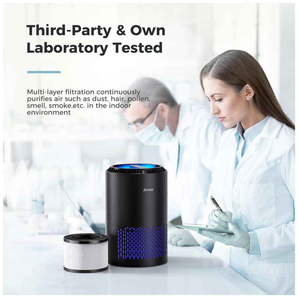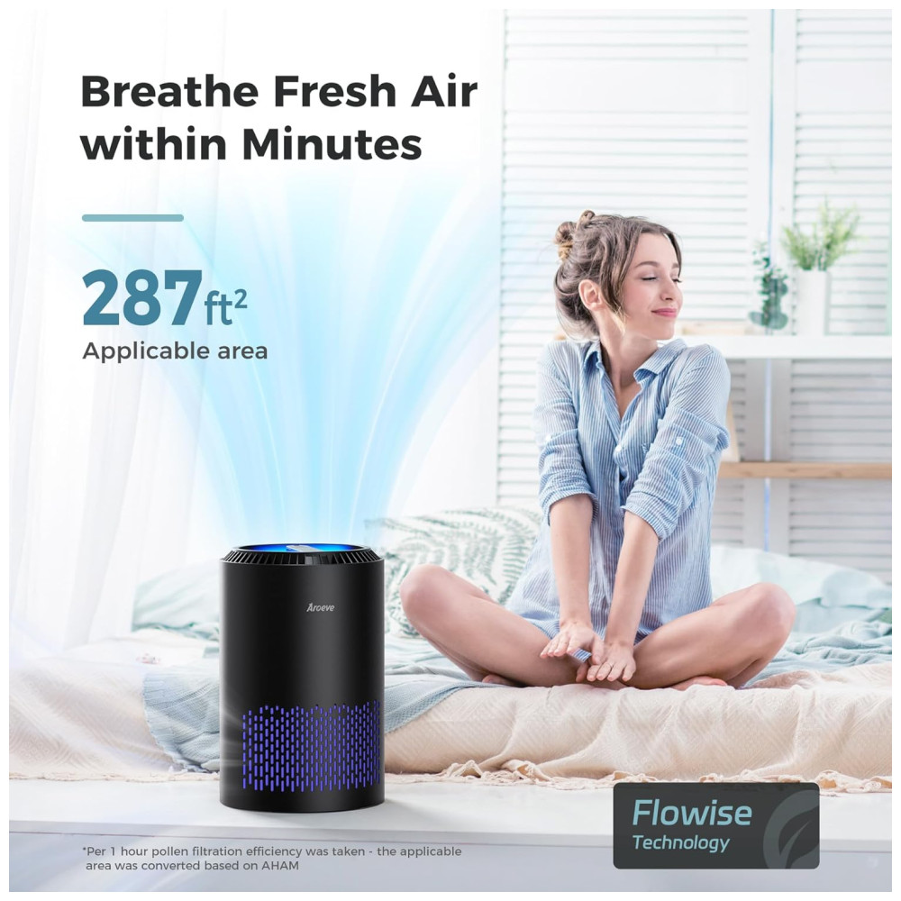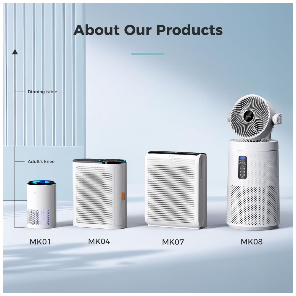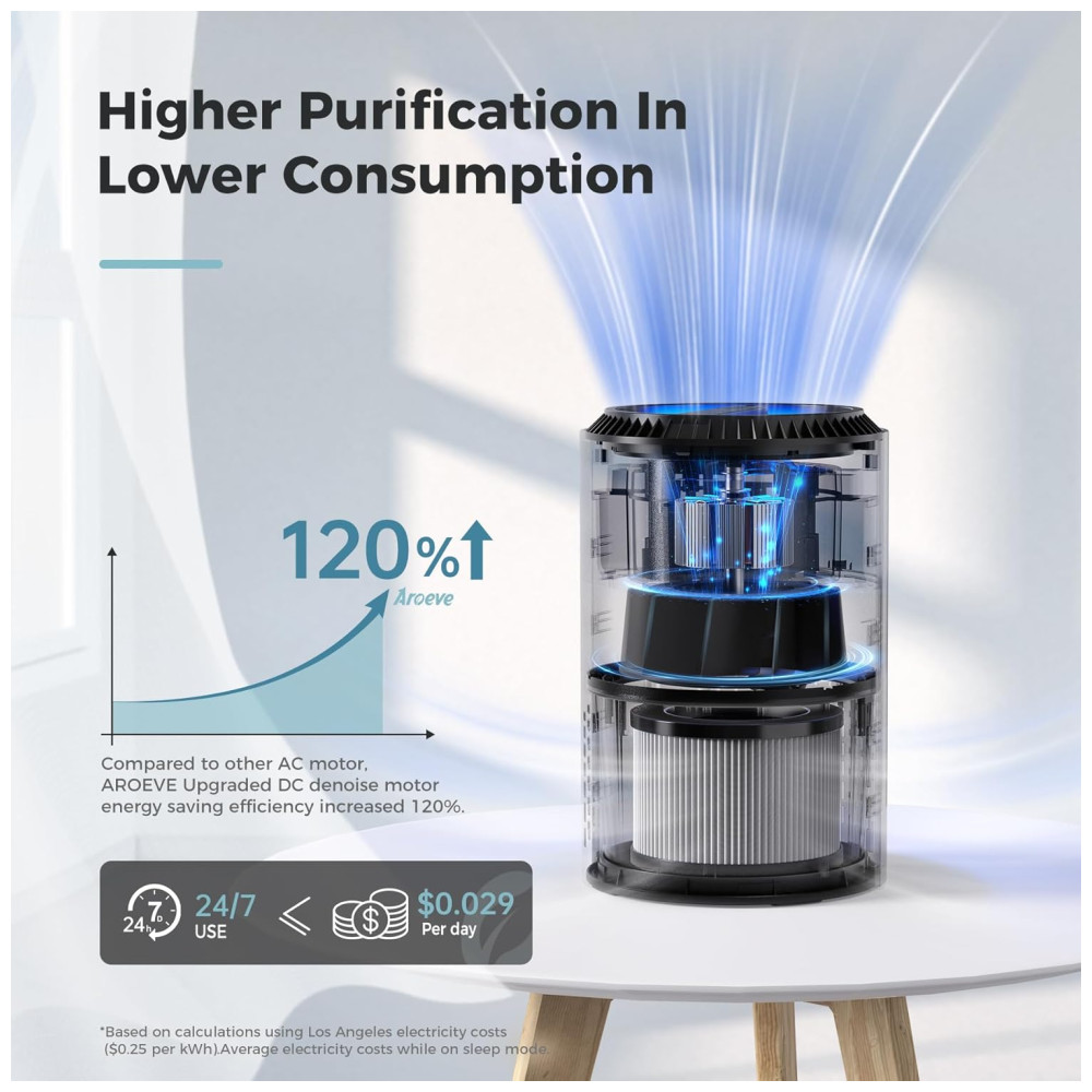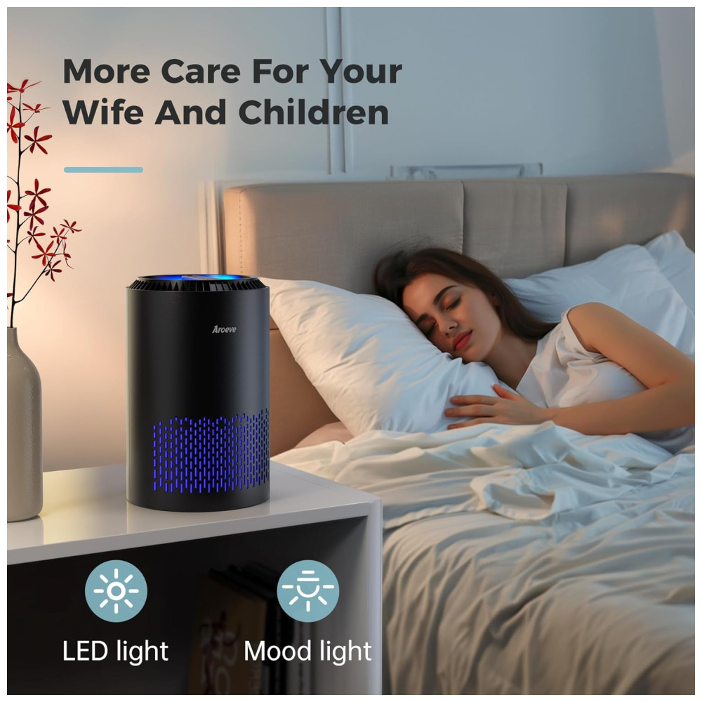 Filtragem eficiente de partículas o purificador de ar AROEVE usa o filtro H13 HEPA, que pode filtrar efetivamente quaisquer partículas maiores que 0,3 mícrons, como fumaça, pólen, caspa, cabelo, cheiro. não precisa mais se preocupar com problemas de qualidade do ar, basta ligar o produto e desfrutar de uma vida saudável.