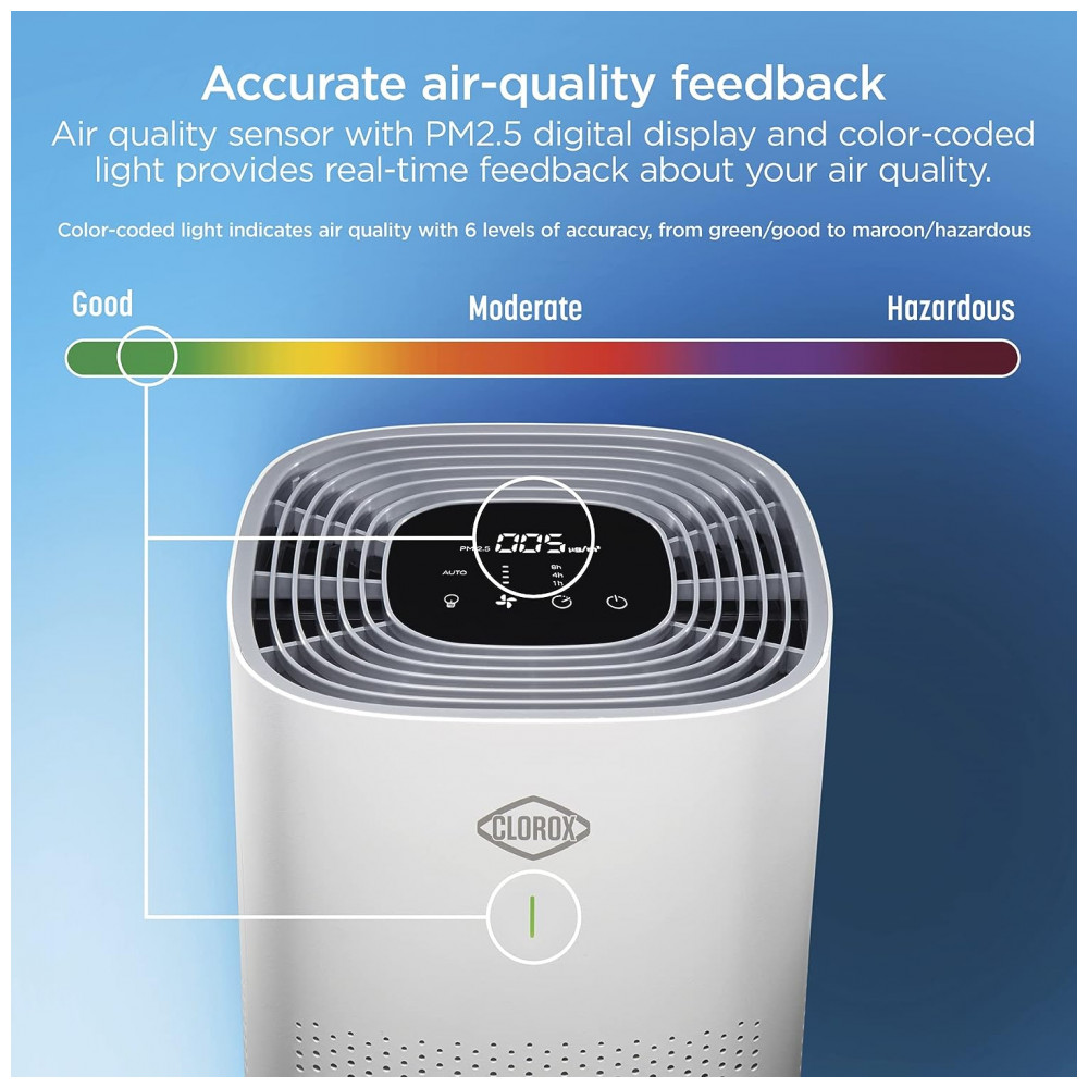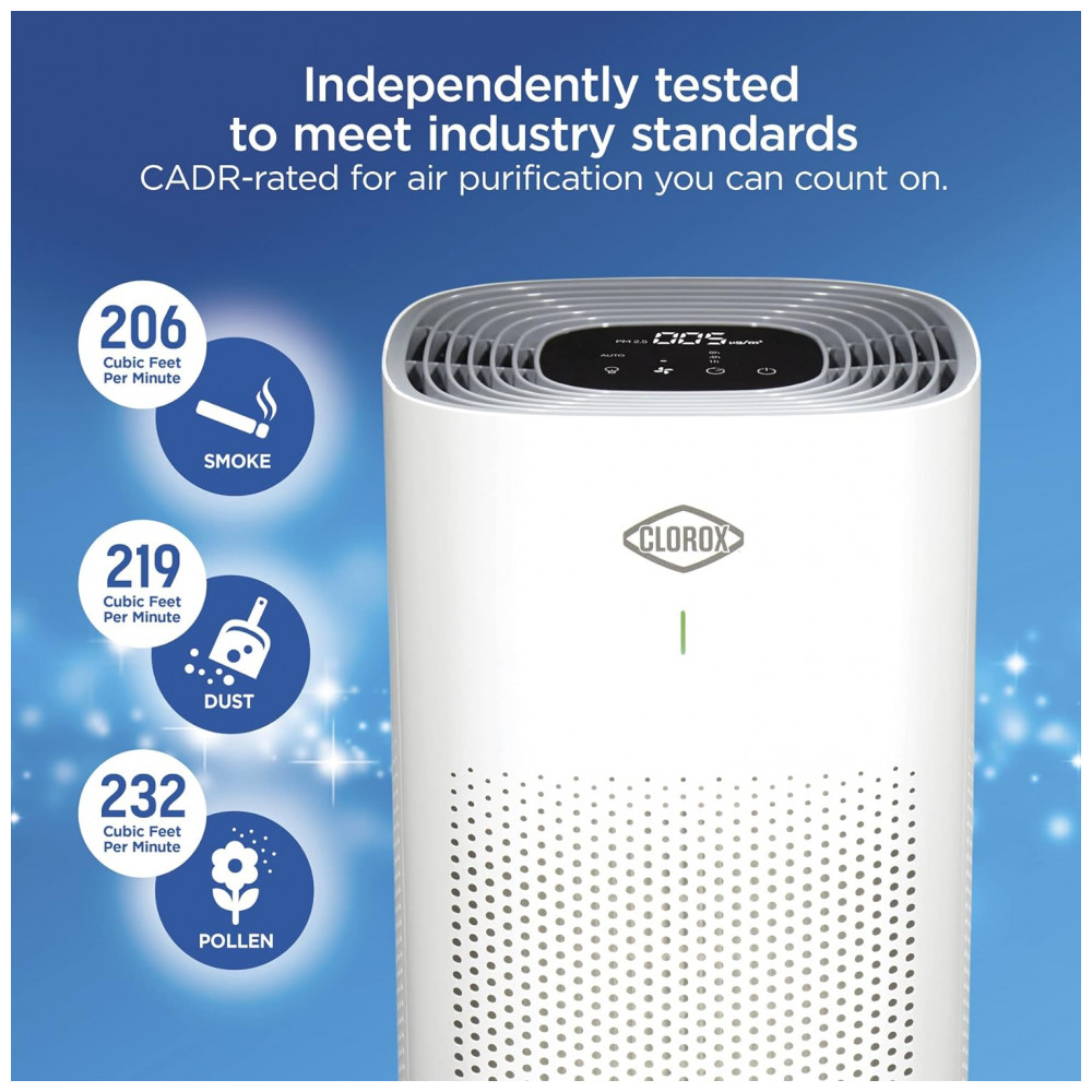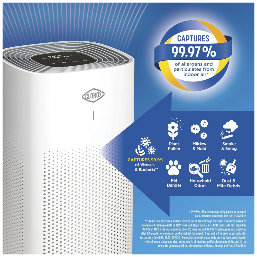 CAPTURA 99,97 DE ALÉRGICOS E PARTÍCULAS E 99,9 DE VÍRUS E BACTÉRIAS. Com o purificador de ar Clorox, você pode respirar mais facilmente. Ele possui um sistema de filtragem HEPA verdadeira que é capaz de capturar 99,97 de partículas tão pequenas quanto 0,1 mícron, além de possuir 2 filtros adicionais para capturar partículas e odores maiores.