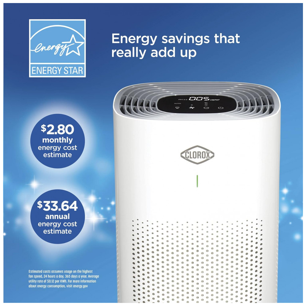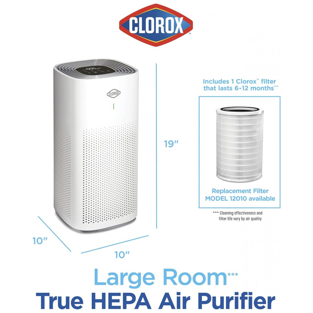 O QUE ESTÁ INCLUÍDO 1 purificador de ar de sala grande Clorox e 1 filtro Clorox True HEPA, que tem uma vida útil de 6 a 12 meses.