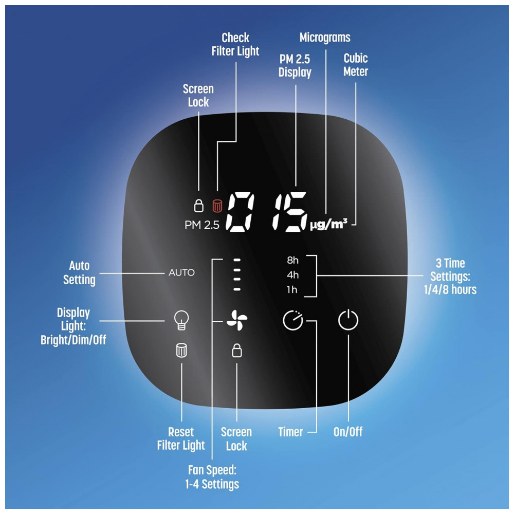 O FEEDBACK PRECISO DA QUALIDADE DO AR é fornecido pelo sensor de qualidade do ar, que exibe em tempo real a leitura PM2,5 em um display digital. Uma luz com código de cores, que varia de verde, bom a marrom, perigoso, indica a qualidade do ar, e o purificador de ar ajusta automaticamente a velocidade do ventilador no modo automático em resposta a mudanças na qualidade do ar atual.