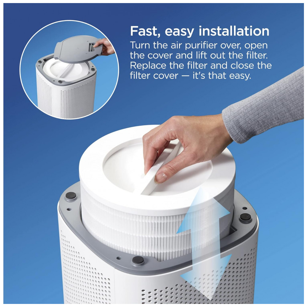 O FILTRO DE 360 DE 3 ESTÁGIOS oferece purificação de ar completa em todas as direções, capturando alérgenos, partículas, vírus e bactérias em 3 camadas de filtro. O pré filtro externo retém grandes partículas de poeira e pelos de animais, enquanto o filtro True HEPA captura 99,97 de alérgenos e partículas, e 99,9 de vírus e bactérias. O filtro de carvão ativo reduz os VOCs e os odores, mantendo o ar com um cheiro fresco.