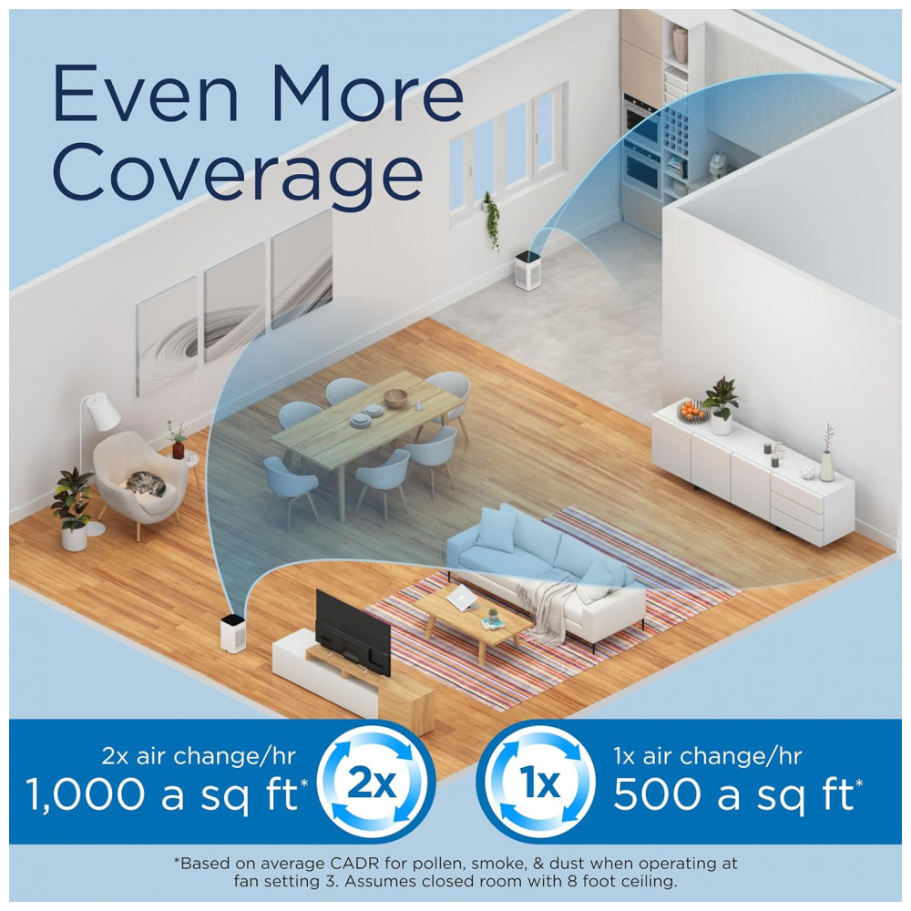 O purificador de ar Medify Air MA 40 com filtro H13 HEPA possui uma cobertura máxima de limpeza de até 92,9 metros quadrados em uma hora, 46,5 metros quadrados em 30 minutos e 23,2 metros quadrados em 15 minutos. Ele é especialmente adequado para quartos de tamanho médio.