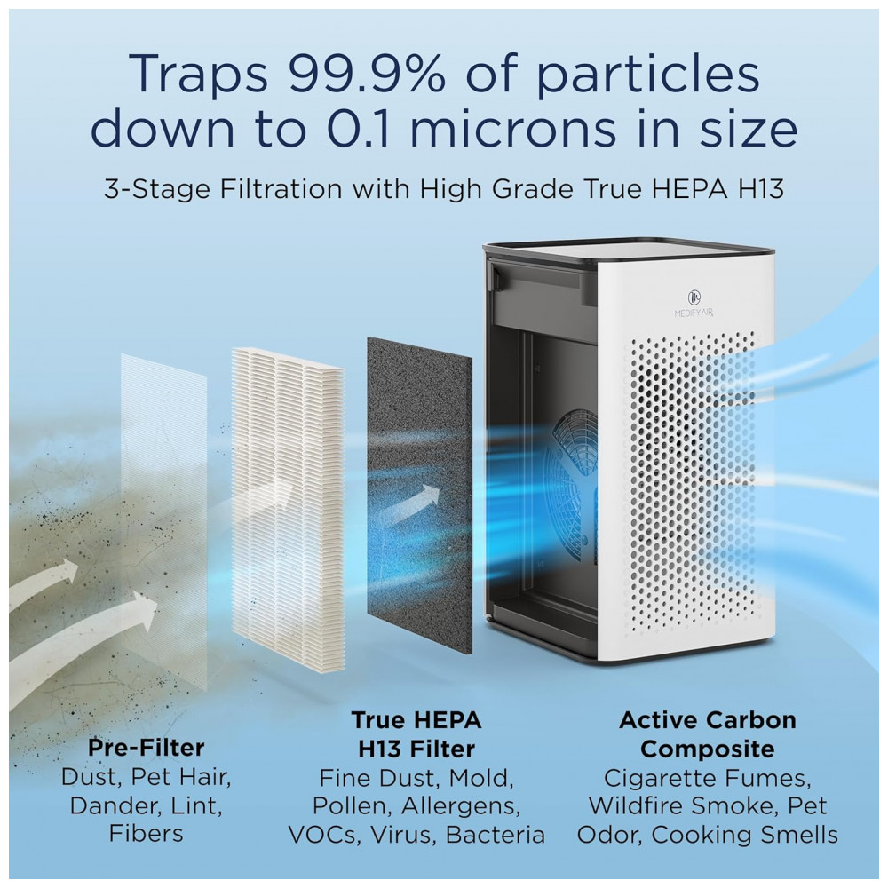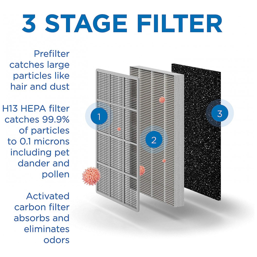 O filtro H13 HEPA oferece uma filtragem confiável, removendo 99,9 das partículas nocivas, como alérgenos, odores, COV, fumaça, pólen, pelos de animais, poeira, poluição atmosférica e outros, com tamanho de até 0,1 mícrons. Além disso, ele captura partículas mais finas em comparação com o filtro HEPA H11, que captura partículas de 0,3 mícrons.