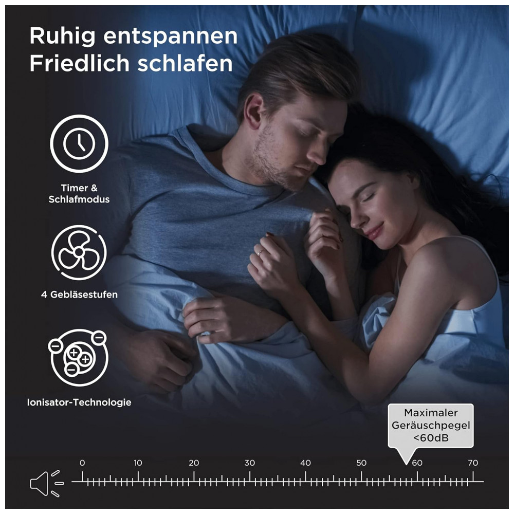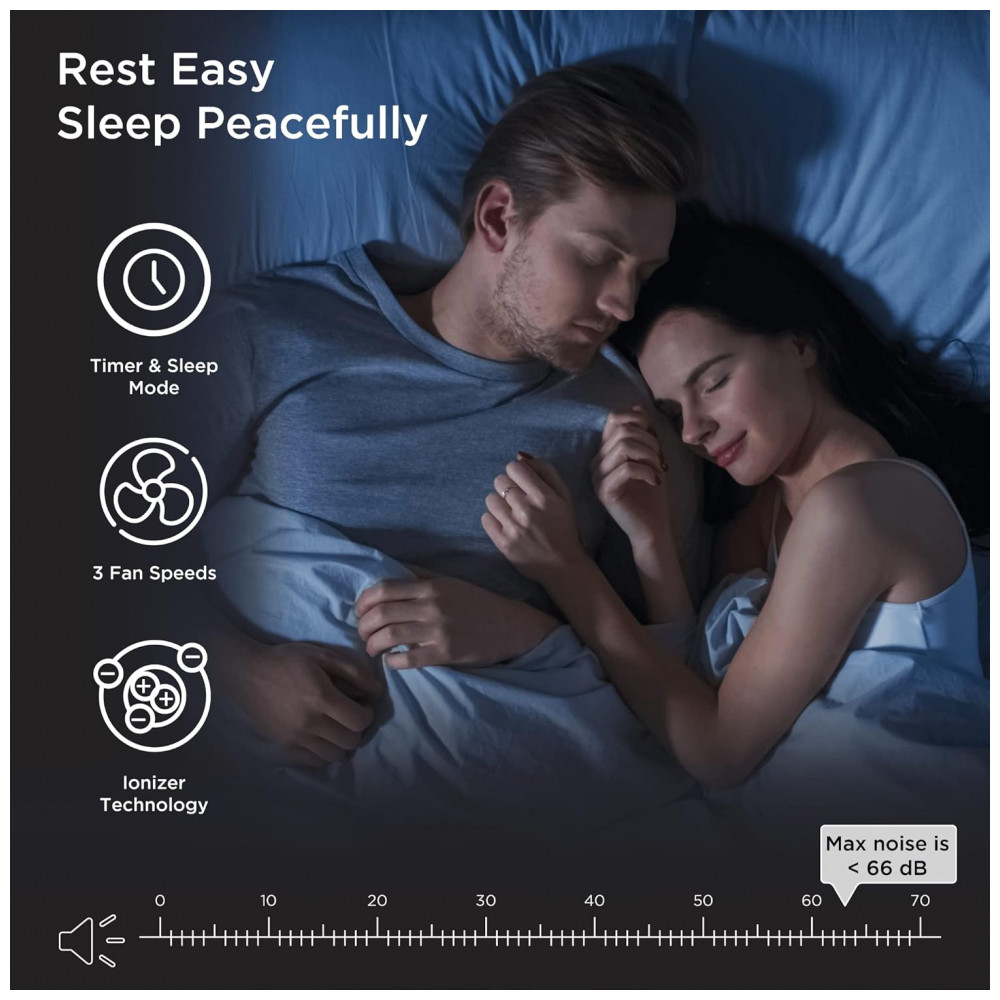 QUIETO ULTRA Escolha entre 3 velocidades do ventilador, com a configuração mais baixa operando praticamente em silêncio. Funciona com 110 Volts, com um nível de ruído mínimo de 46dB e máximo de 66dB. Para a operação mais discreta, ative o modo de suspensão para desligar completamente as luzes do painel da unidade.