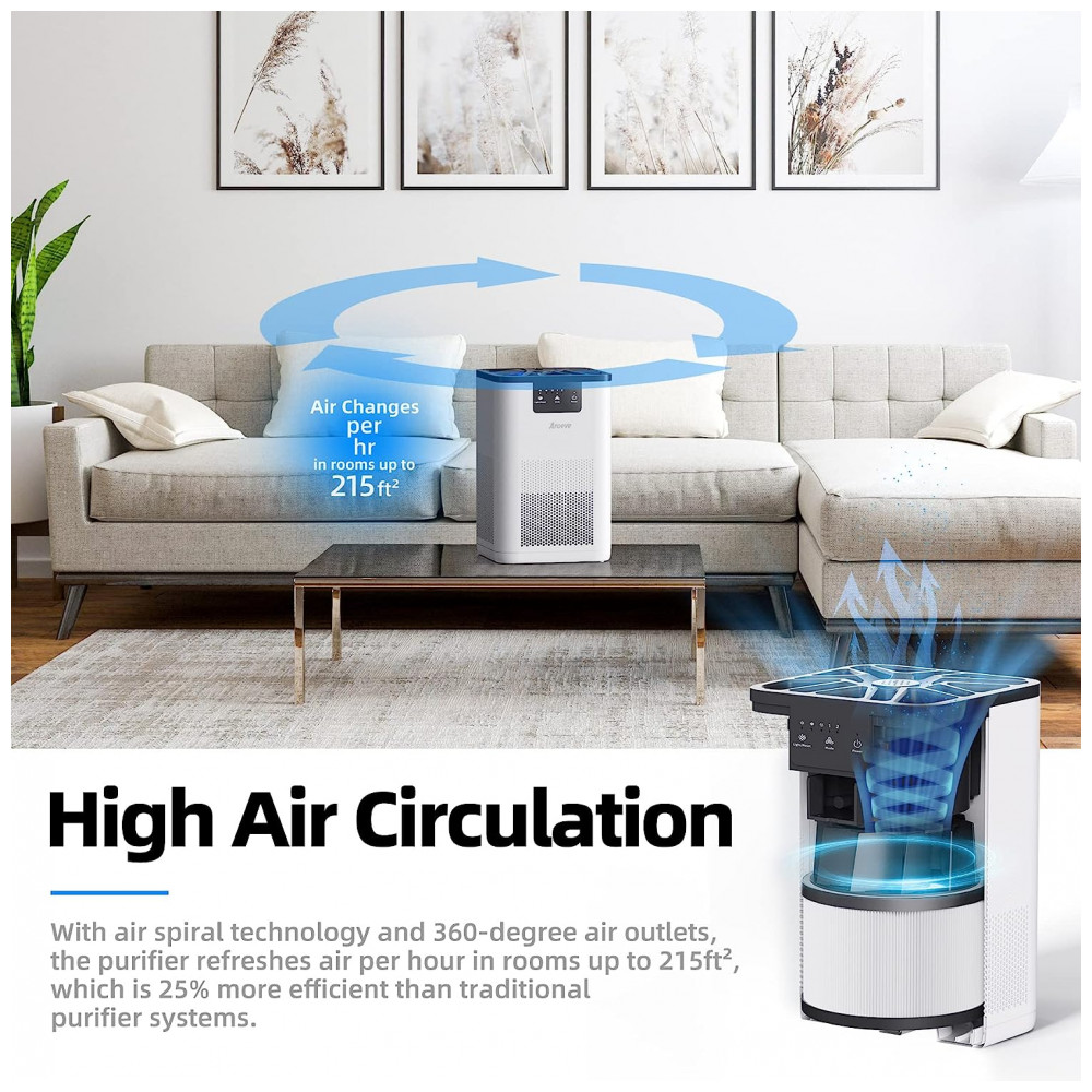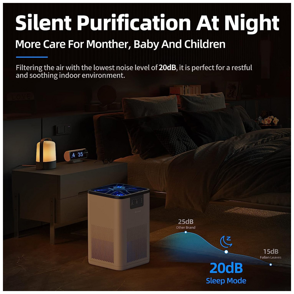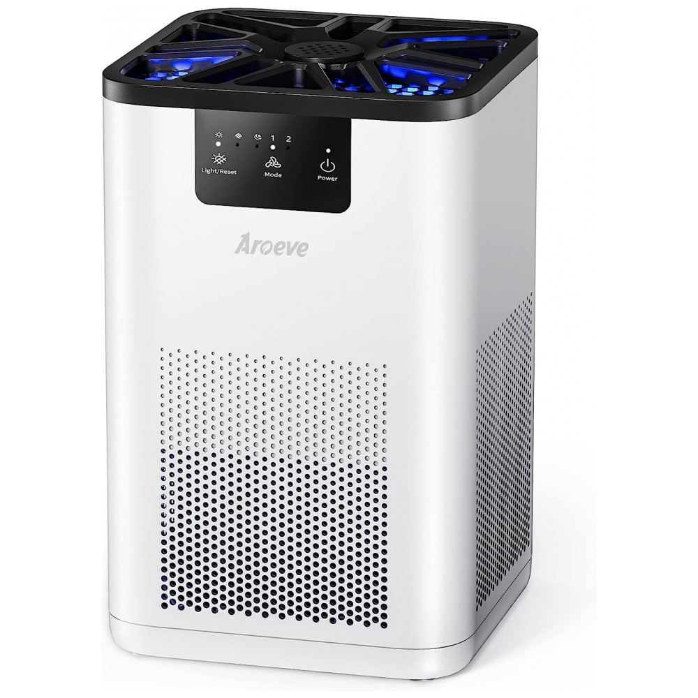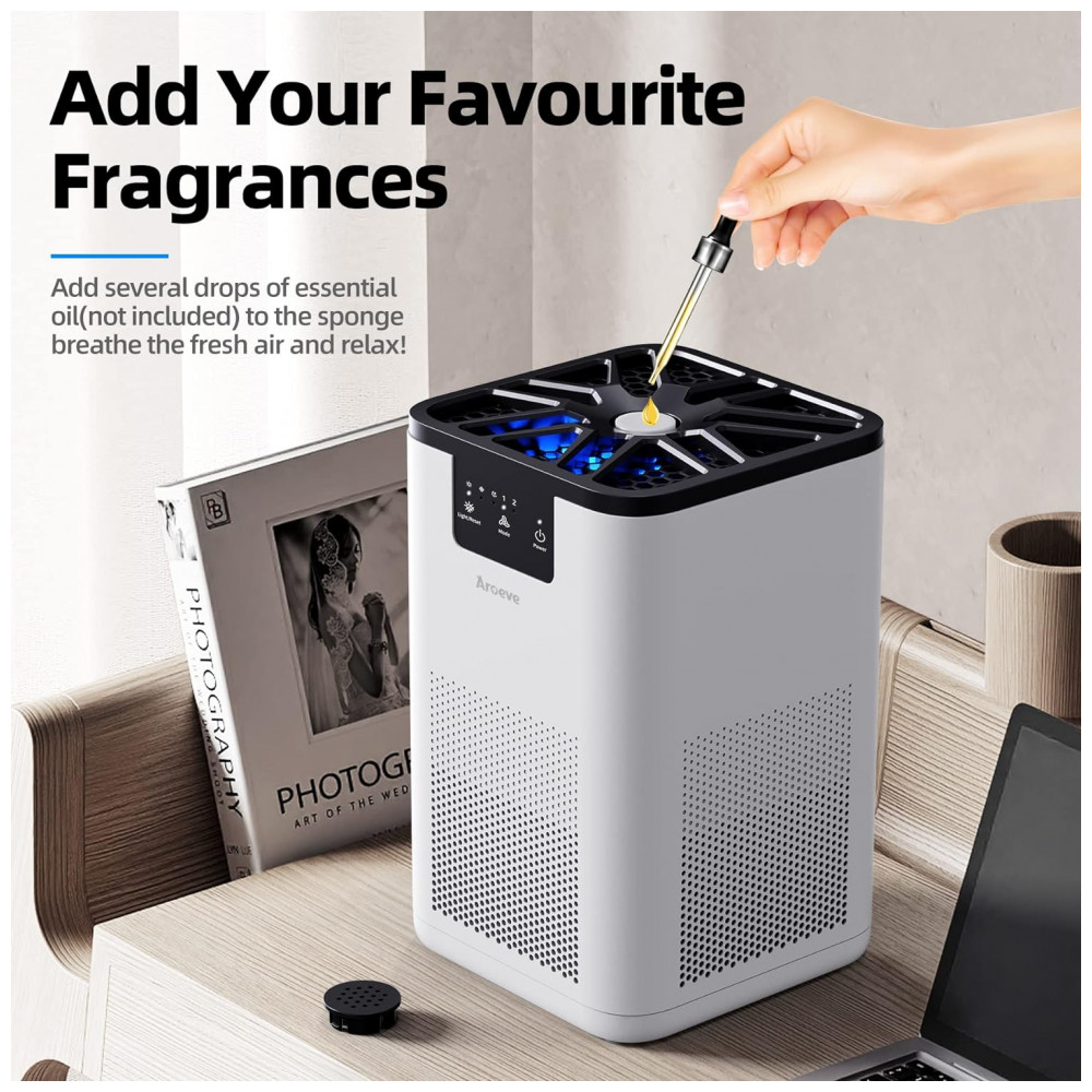O purificador de ar AROEVE MK06, na cor branca, oferece filtragem eficiente para partículas de fumaça, pólen, cabelos e odores, sendo indicado para ambientes residenciais de até 20 m². Possui tecnologia de circulação de ar 360°, com renovação do ambiente a cada hora, e funcionamento silencioso em 20 dB no modo noturno. Conta com função de aromaterapia — basta adicionar gotas de óleo essencial à almofada superior, proporcionando agradável fragrância ao ambiente. O equipamento possui painel de controle sensível ao toque, base compacta para rápida instalação e é certificado por órgãos internacionais de segurança elétrica. Utiliza filtro substituível e recomenda-se a troca a cada 3 a 6 meses para melhor desempenho. Ideal para quartos, salas, escritórios e ambientes com presença de animais domésticos.