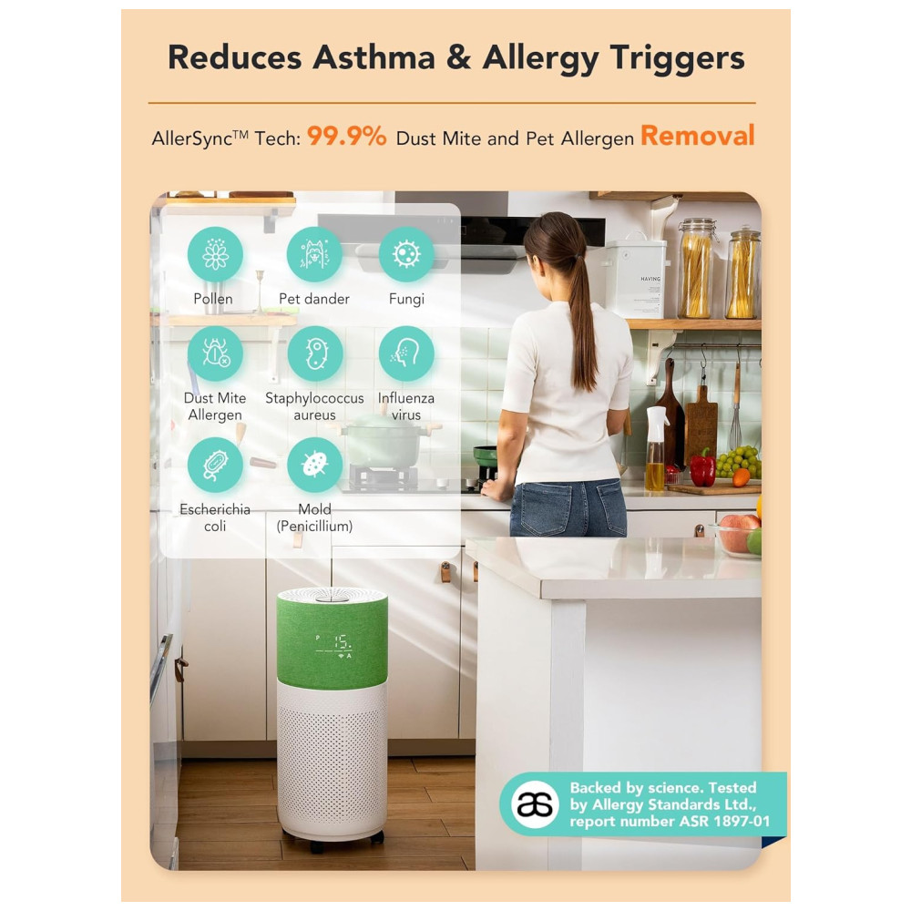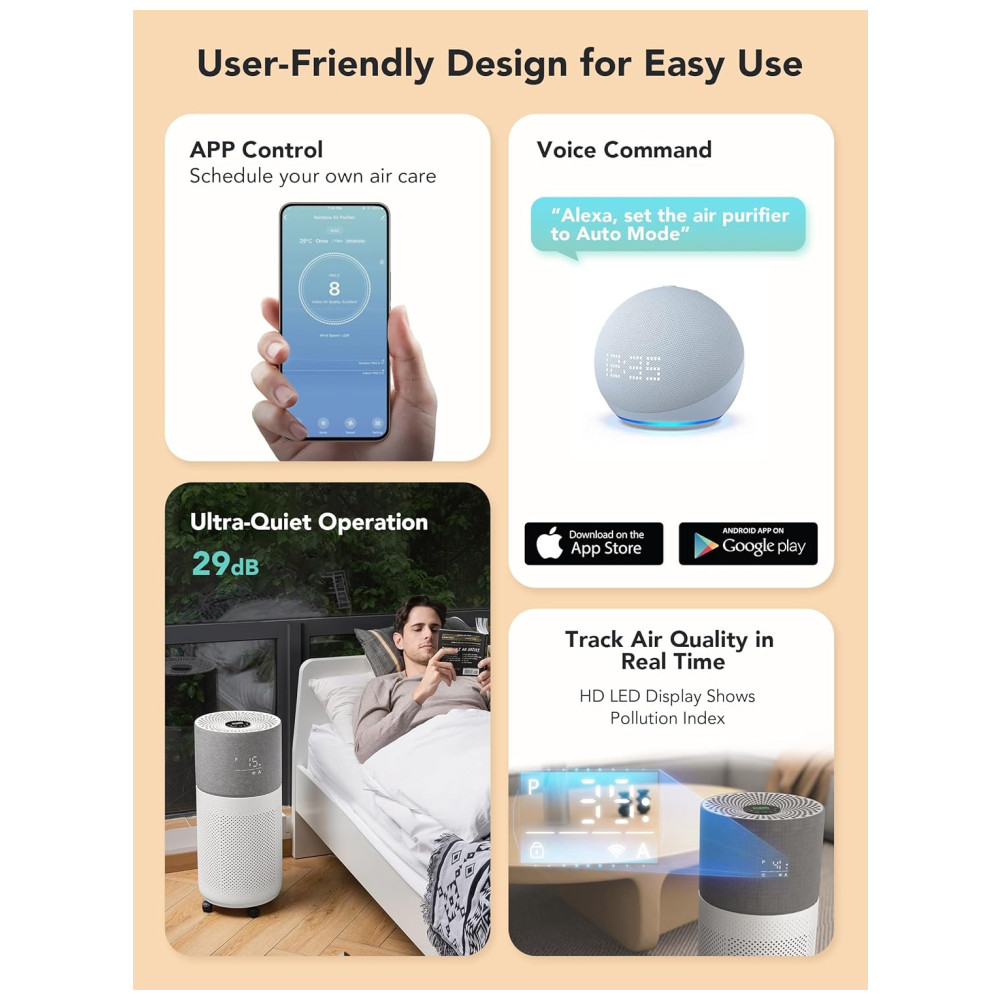 CONTROLE DE APLICATIVO COM COMANDO DE VOZ Para maior comodidade, você pode controlar este purificador de ar doméstico remotamente e sem usar as mãos com o aplicativo inteligente incorporado Gerencie as configurações, supervisione a pureza do ar e crie programações, entre outras operações, enquanto a compatibilidade com Alexa permite comandos de voz para controle mãos livres os recursos inteligentes de nosso grande purificador de ar para quarto impressionarão todos.