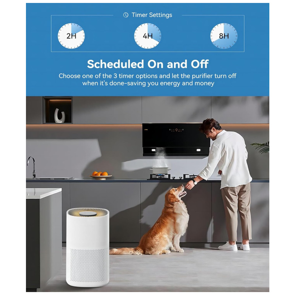 ECONOMIZE ENERGIA A potência máxima deste purificador de ar é de apenas 38W, muito menor do que outros purificadores de ar de ampla cobertura. O Timer permitirá que você escolha entre 2 4 8 horas antes de desligar automaticamente para economizar energia.