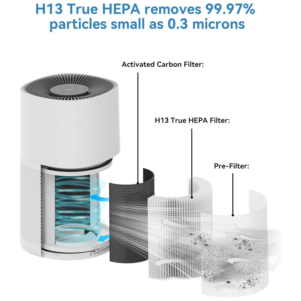 SISTEMA DE FILTRAGEM DE 3 ESTÁGIOS O filtro é composto por 3 camadas pré filtro, filtro H13 True HEPA e filtro de carvão ativado, que capta até 99,97 dos poluentes transportados pelo ar poeira, pêlos de animais, pólen, fumaça, cabelo e outros alérgenos tão pequenos quanto 0,3 mícrons. Certificado CARB, ETL e FCC.