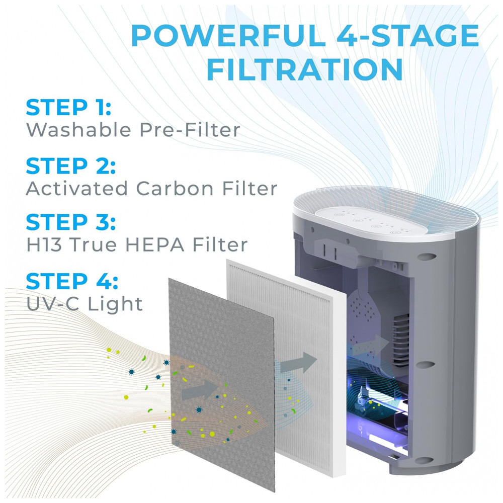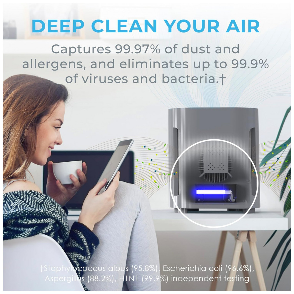 PURIFICAÇÃO DO AR EM 3 ESTÁGIOS Limpe o ar de 99,97 das partículas de poeira, pólen, pêlos de animais, fumaça e odores domésticos. Fase 1 Pré filtro e filtro de carvão ativado Estágio 2 Filtro True HEPA Estágio 3 luz UV C.