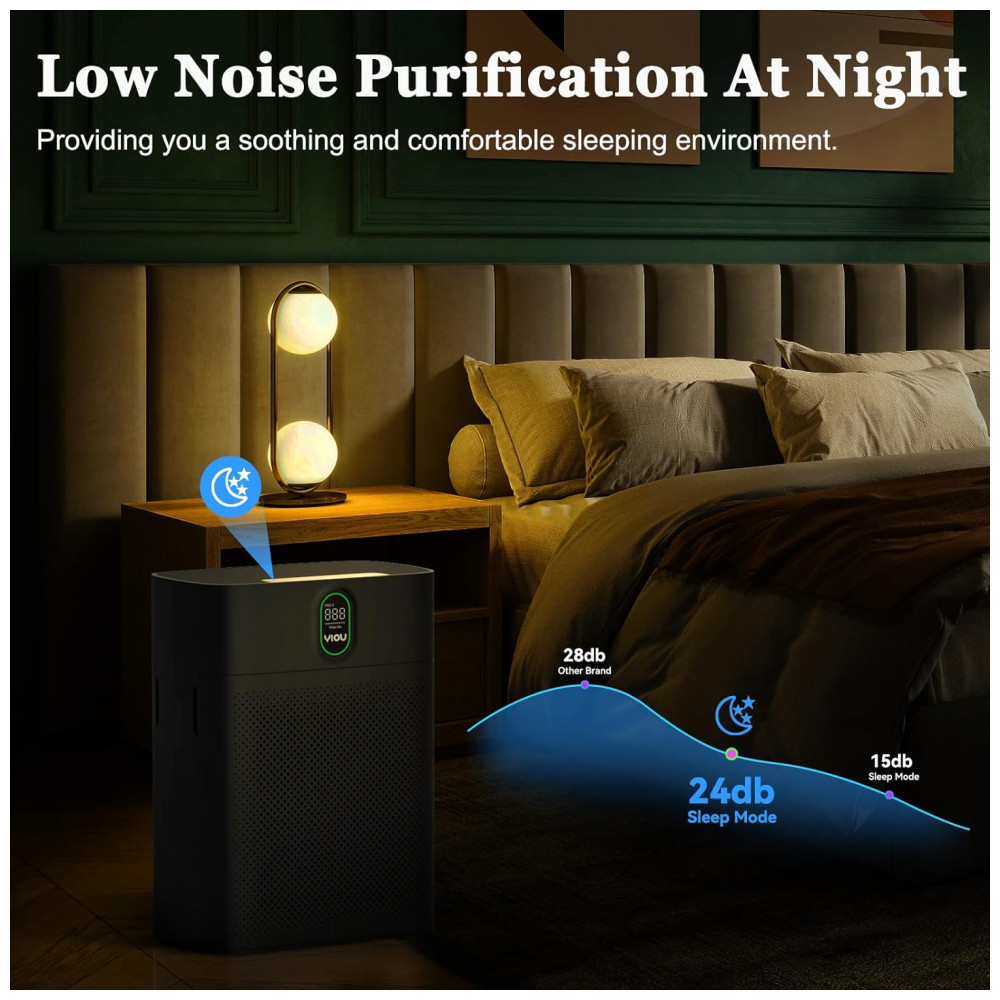 Filtros de ar duplos e exibição de porcentagem de vida útil do filtro O purificador de ar YIOU M1 é construído com entradas duplas de quase 360 e funciona com 2 filtros de ar H13 HEPA verdadeiros que podem bloquear poluentes transportados pelo ar de até 0,3 m de diâmetro. Particularmente, a perda de vida útil do filtro é mostrada claramente na tela de LED.