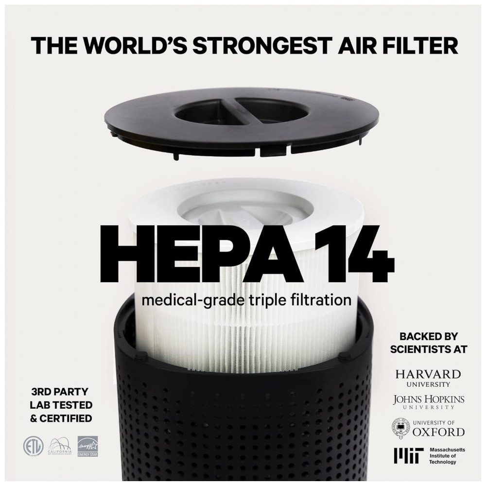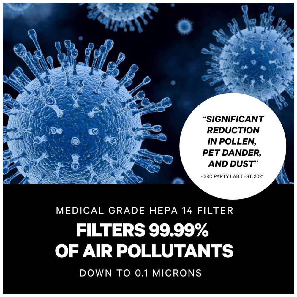 PRIMEIRO FILTRO HEPA 14 DO MUNDO O filtro HEPA 14 de grau médico remove até 99,99 de partículas finas de até 0,1 mícrons de tamanho. Isso inclui poeira, pêlos de animais, odores e fumaça. Mais poderoso que um HEPA 13. O primeiro e único filtro HEPA 14 disponível mente testado on line que atende ao padrão ISO 29463 3.
