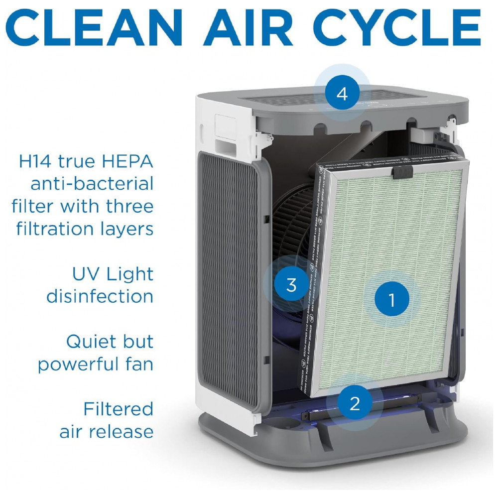 FILTRAGEM DUPLA HEPA H14 Confiável para remover 99,99 das partículas nocivas, incluindo alérgenos, odores, VOCs, fumaça, pólen, pêlos de animais, poeira, poluição, contaminantes e muito mais até 0,1 mícrons de tamanho. Captura partículas mais finas que HEPA H11 0,3 mícrons.