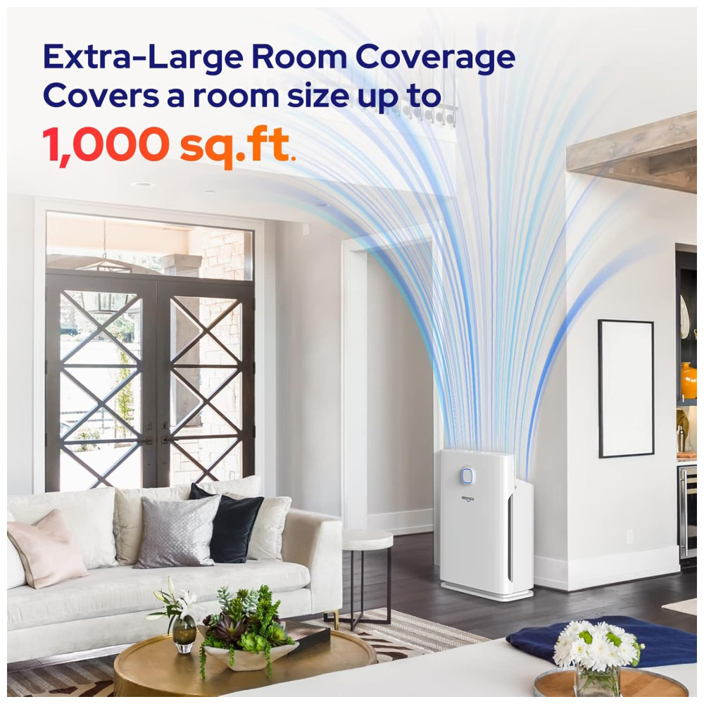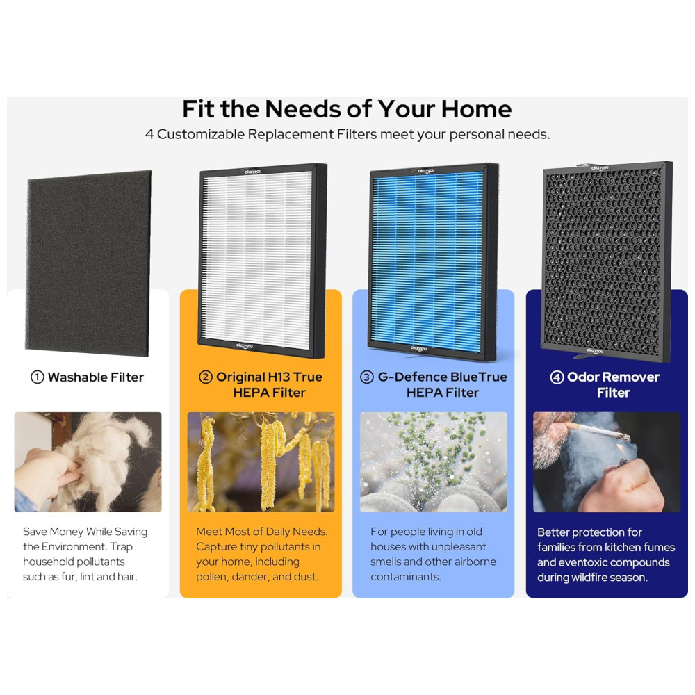Poderoso sistema de filtragem de 5 estágios combina pré filtro lavável, filtro H13 True HEPA, filtro Nanois, filtro True HEPA premium e filtro de carvão ativado de favo de mel em 1, captura 99,97 dos poluentes do ar tão pequenos quanto 0,3 mícrons, como poeira, pólen, fumaça, cabelo e odores domésticos também decompõe com segurança vários gases nocivos, como formaldeído, VOCs decompõe poluentes tão pequenos quanto 0,3 mícrons com durabilidade eterna e a mais alta ação de osmose.