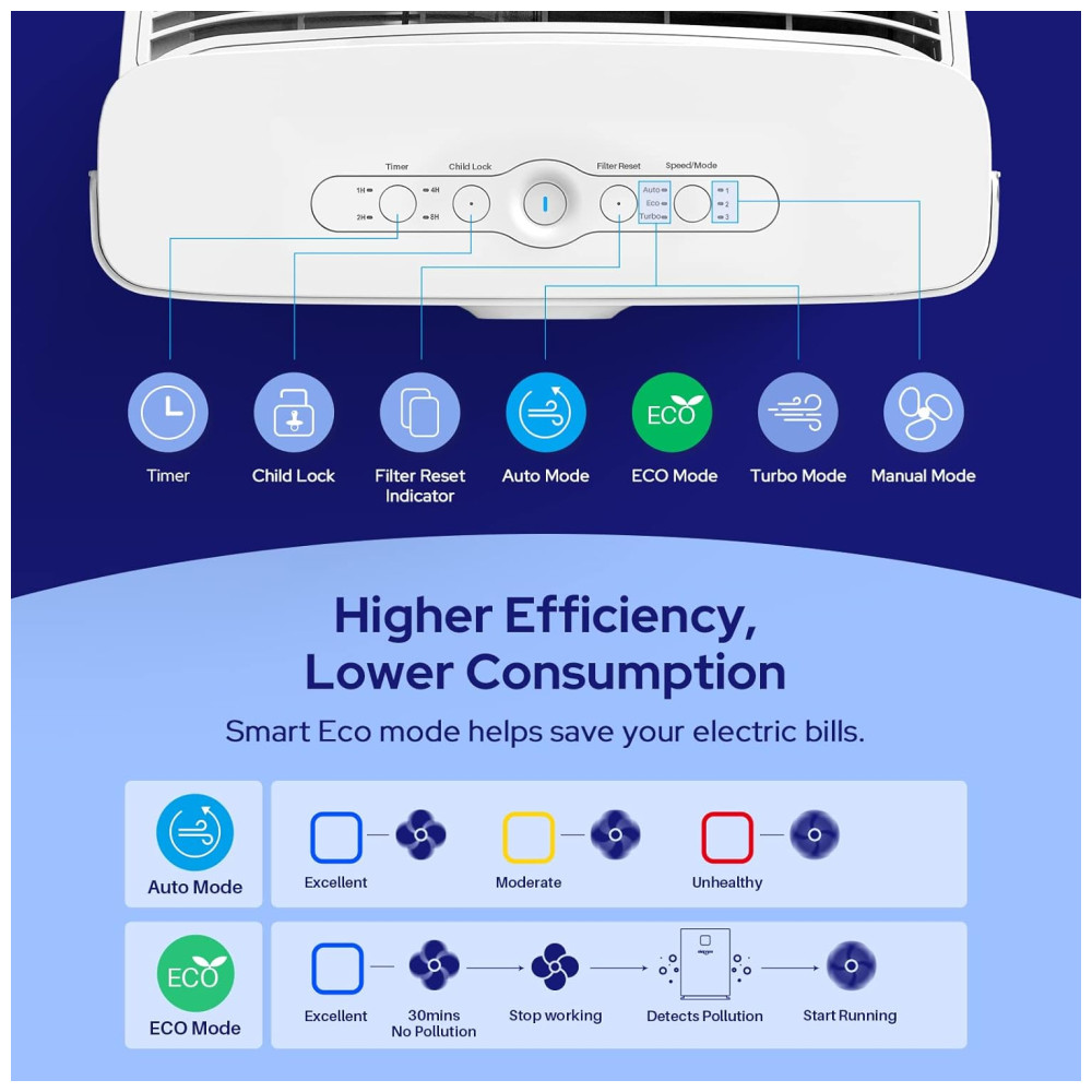 Recursos de bônus O modo Child Lock protege seus filhos contra erros de operação O modo Eco parará de funcionar automaticamente quando nenhuma poluição for detectada por 30 minutos para economizar sua energia e dinheiro, além disso, todas as luzes serão apagadas e lhe dará um doce sonho imperturbável O modo Turbo traz a purificação mais rápida.