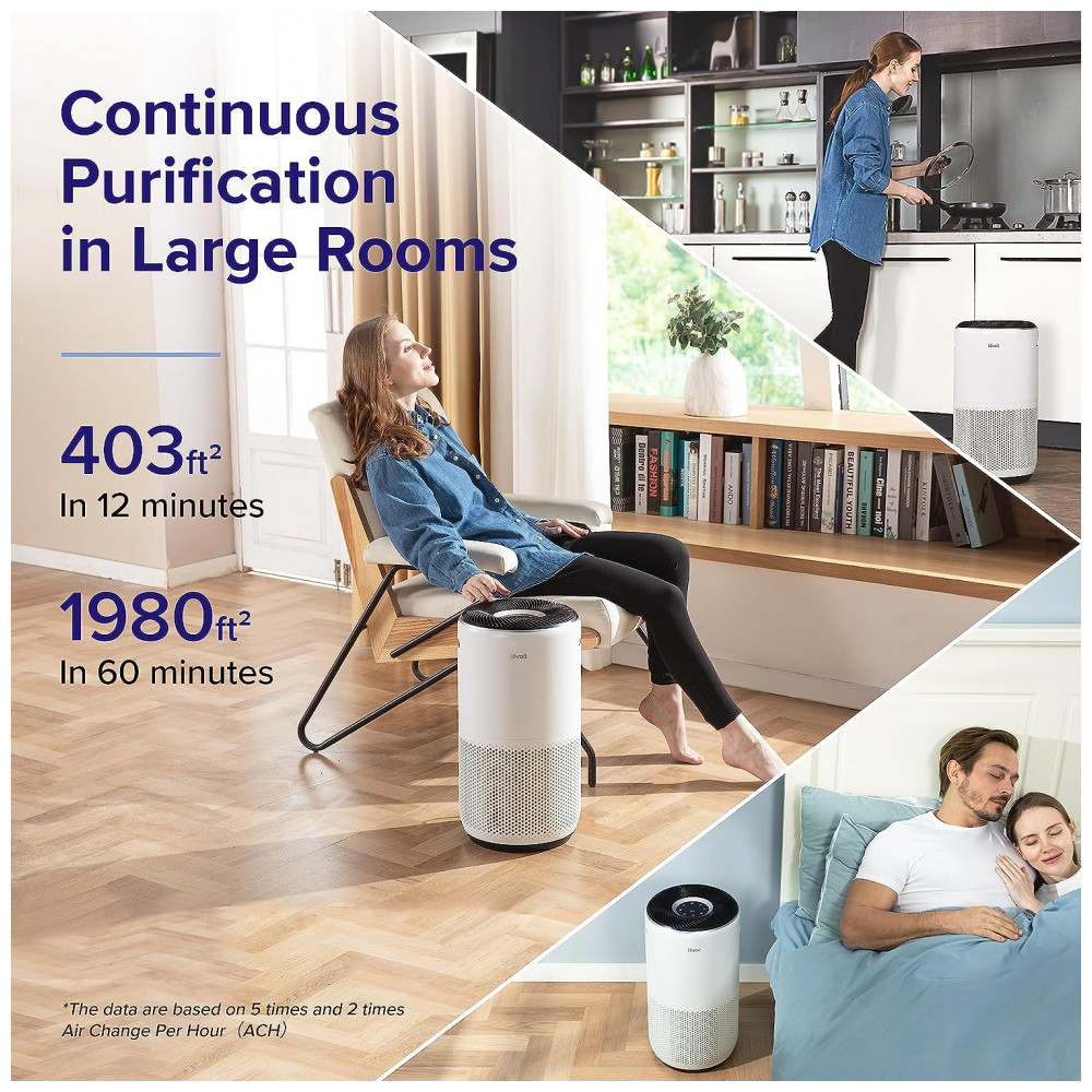 GRANDE COBERTURA: O purificador de ar Levoit Core 400S Smart True HEPA de alto desempenho pode purificar salas amplas, como quartos, salas, cozinhas e porões. Purifique uma sala de 37,44 metros quadrados 5x por hora e uma sala de 183,03 metros quadrados 1x por hora.